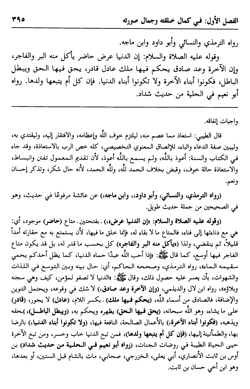 وقوله -عليه الصلاة والسلام: "إن الدنيا عرض حاضر, يأكل منه البر والفاجر، وإن الآخرة وعد صادق, يحكم فيها ملك عادل قادر، يحق فيها الحق ويبطل الباطل، فكونوا أبناء الآخرة ولا تكونوا أبناء الدنيا، فإن كل أمّ يتبعها ولدها". رواه أبو نعيم في الحلية من حديث شداد.