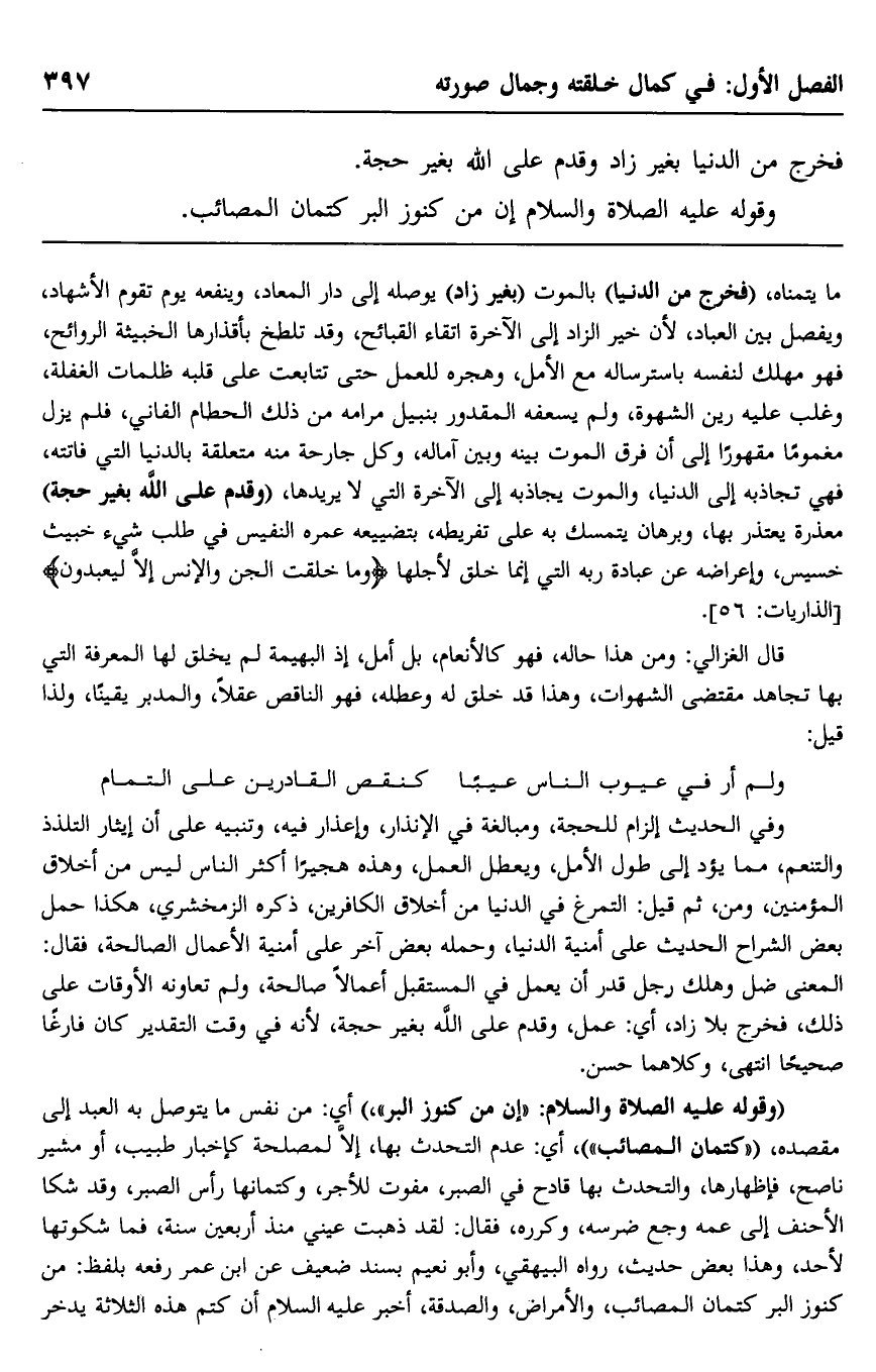 ما يتمنَّاه "فخرج من الدنيا" بالموت "بغير زاد" يوصّله إلى دار المعاد، وينفعه يوم تقوم الأشهاد، ويفصل بين العباد؛ لأن خير الزاد إلى الآخرة اتقاء القبائح، وقد تلطَّخ بأقذارها الخبيثة الروائح، فهو مهلك لنفسه باسترساله مع الأمل، وهجره للعمل, حتى تتابعت على قلبه ظلمات الغفلة، وغلب عليه رين الشهوة، ولم يسعفه المقدور بنيل مرامه من ذلك الحطام الفاني، فلم يزل مغمومًا مقهورًا إلى أن فرق الموت بينه وبين آماله، وكل جارحة منه متعلقة بالدنيا التي فاتته، فهي تجاذبه إلى الدنيا، والموت يجاذبه إلى الآخرة التي لا يريدها، "وقدم على الله بغير حجة" معذرة يعتذر بها، وبرهان يتمسّك به على تفريطه، بتضييعه عمره النفيس في طلب شيء خبيث خسيس، وإعراضه عن عبادة ربه التي إنما خُلِقَ لأجلها {وَمَا خَلَقْتُ الْجِنَّ وَالْإِنْسَ إِلَّا لِيَعْبُدُونِ} [الذاريات: 56] .