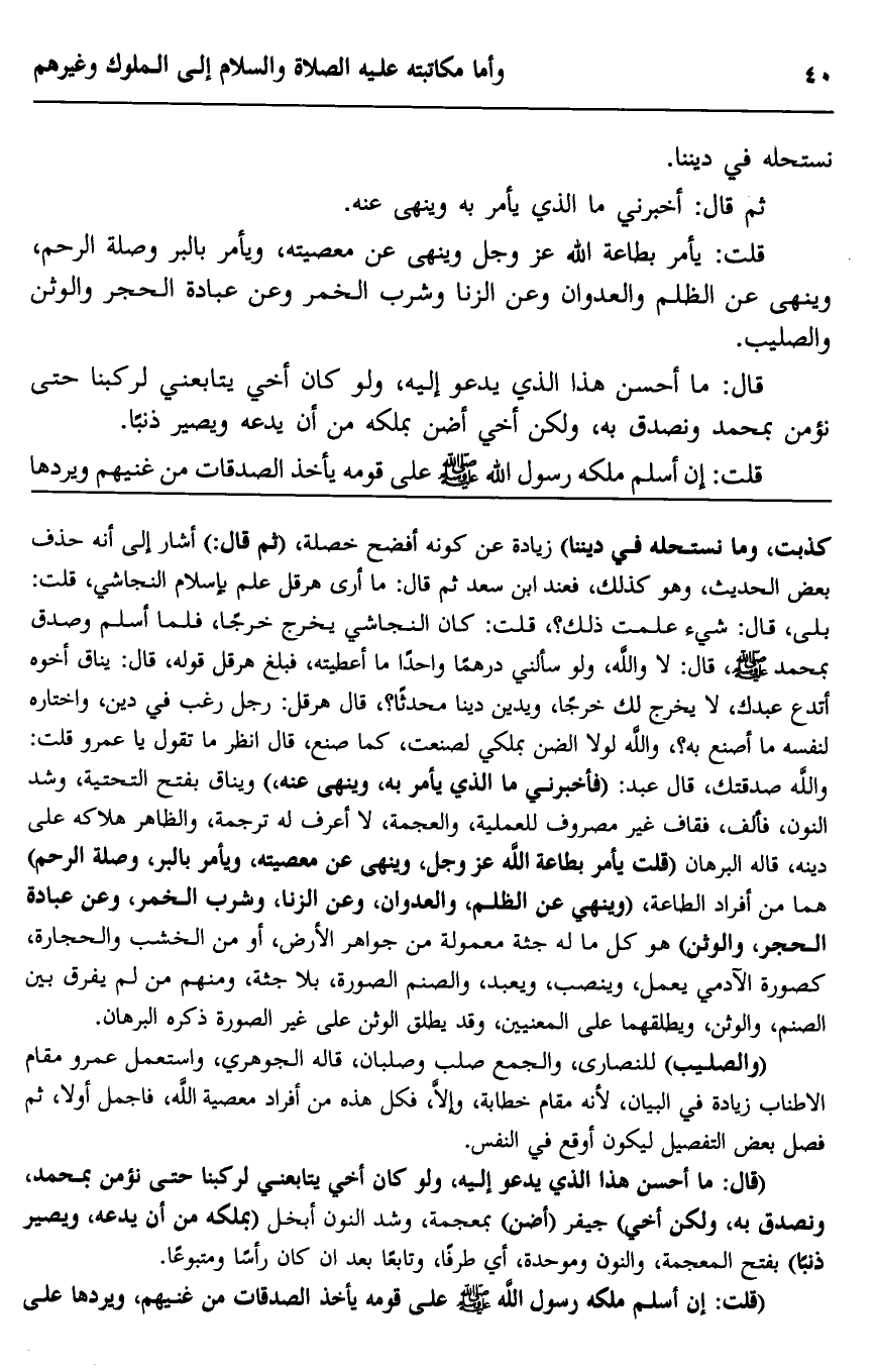 كذبت، وما نستحله في ديننا" زيادة عن كونه أفضح خصلة، "ثم قال": أشار إلى أنه حذف بعض الحديث، وهو كذلك، فعند ابن سعد ثم قال: ما أرى هرقل علم بإسلام النجاشي، قلت: بلى، قال: شيء علمت ذلك؟ قلت: كان النجاشي يخرج خرجًا, فلما أسلم وصدَّق بمحمد -صلى الله عليه وسلم قال: لا والله، ولو سألني درهمًا واحدًا ما أعطيته، فبلغ هرقل قوله، قال: يناق أخوه, أتدع عبدك لا يخرج لك خرجًا، ويدين دينًا محدثًا؟ قال هرقل: رجل رغب في دين واختاره لنفسه, ما أصنع به؟ والله لولا الضنّ بملكي لصنعت كما صنع، قال: انظر ما تقول يا عمرو, قلت: والله صدقتك، قال عبد: "فأخبرني ما الذي يأمر به، وينهى عنه"، ويناق بفتح التحتية، وشد النون، فألف، فقاف غير مصروف للعملية، والعجمة، لا أعرف له ترجمة، والظاهر هلاكه على دينه، قاله البرهان. "قلت: يأمر بطاعة الله -عز وجل، وينهى عن معصيته، ويأمر بالبر وصلة الرحم" هما من أفراد الطاعة، "وينهى عن الظلم، والعدوان، وعن الزنا، وشرب الخمر، وعن عبادة الحجر والوثن", هو كل ما له جثة معمولة من جواهر الأرض، أو من الخشب والحجارة، كصورة الآدمي يعمل وينصب ويعبد، والصنم: الصورة بلا جثة، ومنهم من لم يفرق بين الصنم والوثن، ويطلقهما على المعنيين، وقد يطلق الوثن عل غير الصورة, ذكره البرهان.