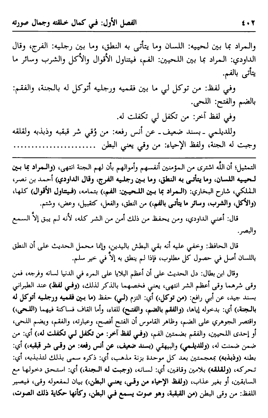 وقال ابن بطال: دَلَّ الحديث على أن أعظم البلايا على المرء في الدنيا لسانه وفرجه, فمن وقي شرهما وقي أعظم الشر. انتهى، يعني: فخصَّهما بالذكر لذلك، "وفي لفظ" عند الطبراني بسند جيد، عن أبي رافع: "من توكَّل"، أي: التزم "لي" حفظ "ما بين فقيمه ورجليه أتوكّل له بالجنة"، أي: بدخوله إياها، "والفقم -بالضم والفتح" للفاء، وأمَّا القاف فساكنة فيهما "اللحى"، واقتصر الجوهري على الضم، وظاهر القاموس أنّ الفتح أفصح، وعبارته: والفقم -ويضم: اللحى، أو إحدى اللحيين، والفقم -بضمتين: الفم، "وفي لفظ آخر: "من تكفَّل لي تكفَّلت له"، أي: من ضمن ضمنت له، "وللديلمي" والبيهقي "بسند ضعيف، عن أنس رفعه: "من وقي شر فبقبه"، أي: بطنه "وذبذبه" بمعجمتين بعد كل موحدة بزنة مذهب، أي: ذكره, سُمِّيَ بذلك لتذبذبه، أي: تحركه، "ولقلقه" بلامين وقافين، أي: لسانه، "وجبت له الجنة"، أي: استحقَّ دخولها مع السابقين، أو بغير عذاب، "ولفظ الإحياء: "من وقي" يعني: البطن" بيان لمفعوله وقى، فيصير اللفظ: من وقي البطن "من القبقبة، وهو صوت يسمع في البطن، وكأنَّها حكاية ذلك الصوت،