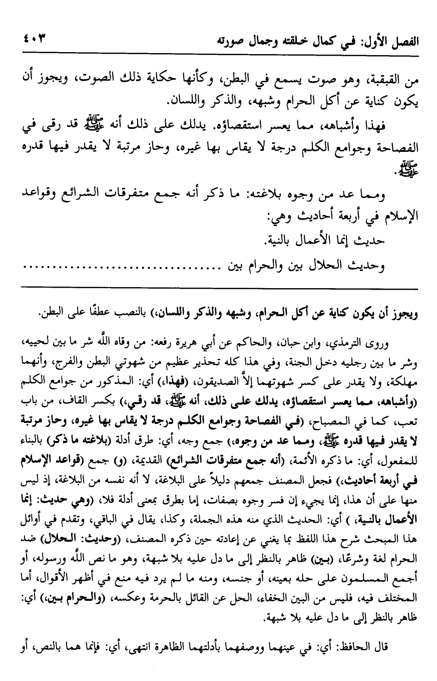 وروى الترمذي، وابن حبان، والحاكم عن أبي هريرة رفعه: " من وقاه الله شر ما بين لحييه، وشر ما بين رجليه دخل الجنة"، وفي هذا كله تحذير عظيم من شهوتي البطن والفرج، وأنهما مهلكة، ولا يقدر على كسر شهوتهما إلّا الصدّيقون، "فهذا"، أي: المذكور من جوامع الكلم "وأشباهه، مما يعسر استقصاؤه، يدلُّك على ذلك، أنه -صلى الله عليه وسلم، قد رقي" بكسر القاف، من باب تعب، كما في المصباح، "في الفصاحة وجوامع الكلم درجة لا يقاس بها غيره، وحاز مرتبة لا يقدر فيها قدره -صلى الله عليه وسلم، ومما عدّ من وجوه" جمع وجه، أي: طرق وأدلة "بلاغته ما ذُكِرَ" بالبناء للمفعول، أي: ما ذكره الأئمة، "أنه جمع متفرقات الشرائع" القديمة، "و" جمع "قواعد الإسلام في أربعة أحاديث"، فجعل المصنّف جمعهم دليلًا على البلاغة، لا أنه نفسه من البلاغة؛ إذ ليس منها على أن هذا إنما يجيء إن فسّر وجوه بصفات، إمّا بطرق بمعنى أدلة فلا، "وهي حديث: "إنما الأعمال بالنية"، أي: الحديث الذي منه هذه الجملة، وكذا، يقال في الباقي، وتقدَّم في أوائل هذا المبحث شرح هذا اللفظ بما يغني عن إعادته حن ذكره المصنف، "وحديث: "الحلال" ضد الحرام لغةً وشرعًا، "بَيِّنٌ" ظاهر بالنظر إلى ما دلَّ عليه بلا شبهة، وهو ما نَصَّ الله ورسوله، أو أجمع المسلمون على حله بعينه، أو جنسه، ومنه ما لم يرد فيه منع في أظهر الأقوال، أمَّا المختلف فيه، فليس من البَيِّن الخفاء، الحل عن القائل بالحرمة وعكسه، "والحرام بَيِّنٌ"، أي: ظاهر بالنظر إلى ما دلَّ عليه بلا شبهة.