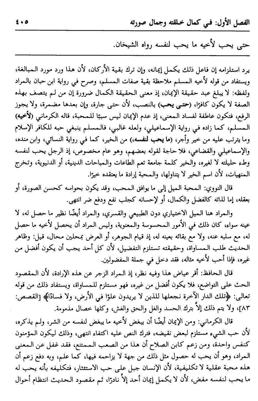 والمراد هنا: الميل الاختياري دون الطبيعي والقسري، والمراد أيضًا نظير ما حصل له، لا عينه سواء، كان ذلك في الأمور المحسوسة والمعنوية، وليس المراد أن يحصل لأخيه ما حصل له، مع سلبه عنه، ولا مع بقائه بعينه له؛ إذ قيام الجوهر أو العرض بمحلين محال، قيل: وظاهر الحديث طلب المساواة، وحقيقته تستلزم التفضيل؛ لأن كل أحد يجب أن يكون أفضل من غيره، فإذا أحب لأخيه مثاله، فقد دخل في جملة المفضولين.