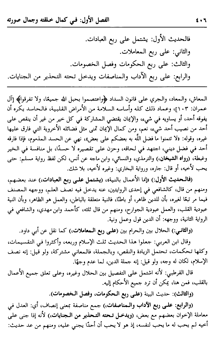 "والرابع: على ربع الآداب والمناصفات"، جمع مناصفة بمعنى إنصاف، أي: العدل في معاملة الإخوان بعضهم مع بعض، "ويدخل تحته التحذير من الجنايات"؛ لأنه إذا جنى على أخيه لم يحب له ما يحب لنفسه؛ إذ هو لا يحب أن أحدًا يجني عليه، ومنهم من عَدَّ حديث: