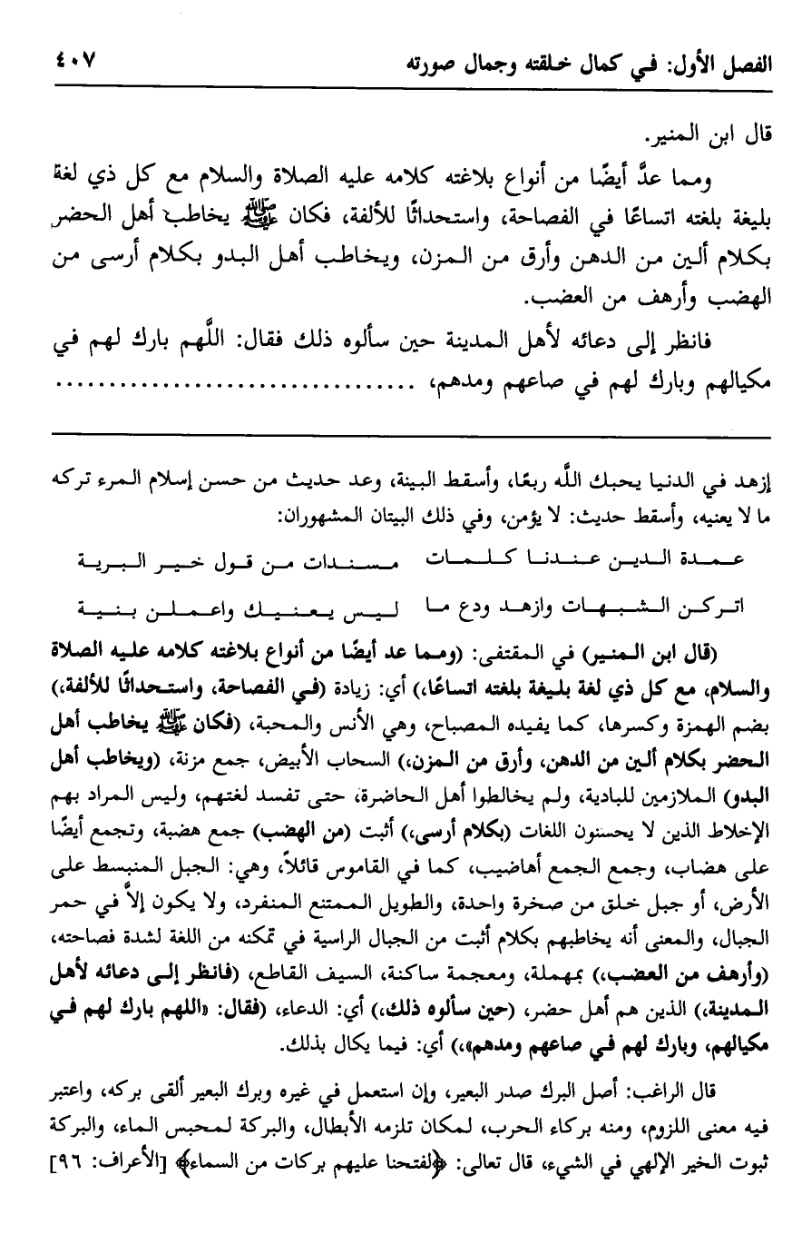 "قال ابن المنير" في المقتفى: "ومما عُدَّ أيضًا من أنواع بلاغته, كلامه -عليه الصلاة والسلام- مع كل ذي لغة بليغة بلغته اتساعًا"، أي: زيادة "في الفصاحة، واستحداثًا للألفة" -بضم الهمزة وكسرها- كما يفيده المصباح، وهي الأنس والمحبَّة، "فكان -صلى الله عليه وسلم- يخاطب أهل الحَضَر بكلام أَلْيَنَ من الدهن، وأرق من المزن"، السحاب الأبيض، جمع مزنة، "ويخاطب أهل البدو" الملازمين للبادية، ولم يخالطوا أهل الحاضرة، حتى تفسد لغتهم، وليس المراد بهم الأخلاط الذين لا يحسنون اللغات "بكلام أرسى"، أثبت "من الهضب" جمع هضبة، وتُجْمَع أيضًا على هِضَاب، وجمع الجمع أهاضيب، كما في القاموس قائلًا، وهي: الجبل المنبسط على الأرض، أو جبل خلق من صخرة واحدة، والطويل الممتنع المنفرد، ولا يكون إلا في حُمُر الجبال، والمعنى: إنه يخاطبهم بكلام أثبت من الجبال الراسية في تمكُّنِه من اللغة لشدة فصاحته، "وأرهف من العضب" -بمهملة ومعجمة ساكنة- السيف القاطع، "فانظر إلى دعائه لأهل المدينة"، الذين هم أهل حضر، "حين سألوه ذلك"، أي: الدعاء، "فقال: "اللهمَّ بارك لهم في مكيالهم، وبارك لهم في صاعهم ومُدِّهم"، أي: فيما يكال بذلك.
