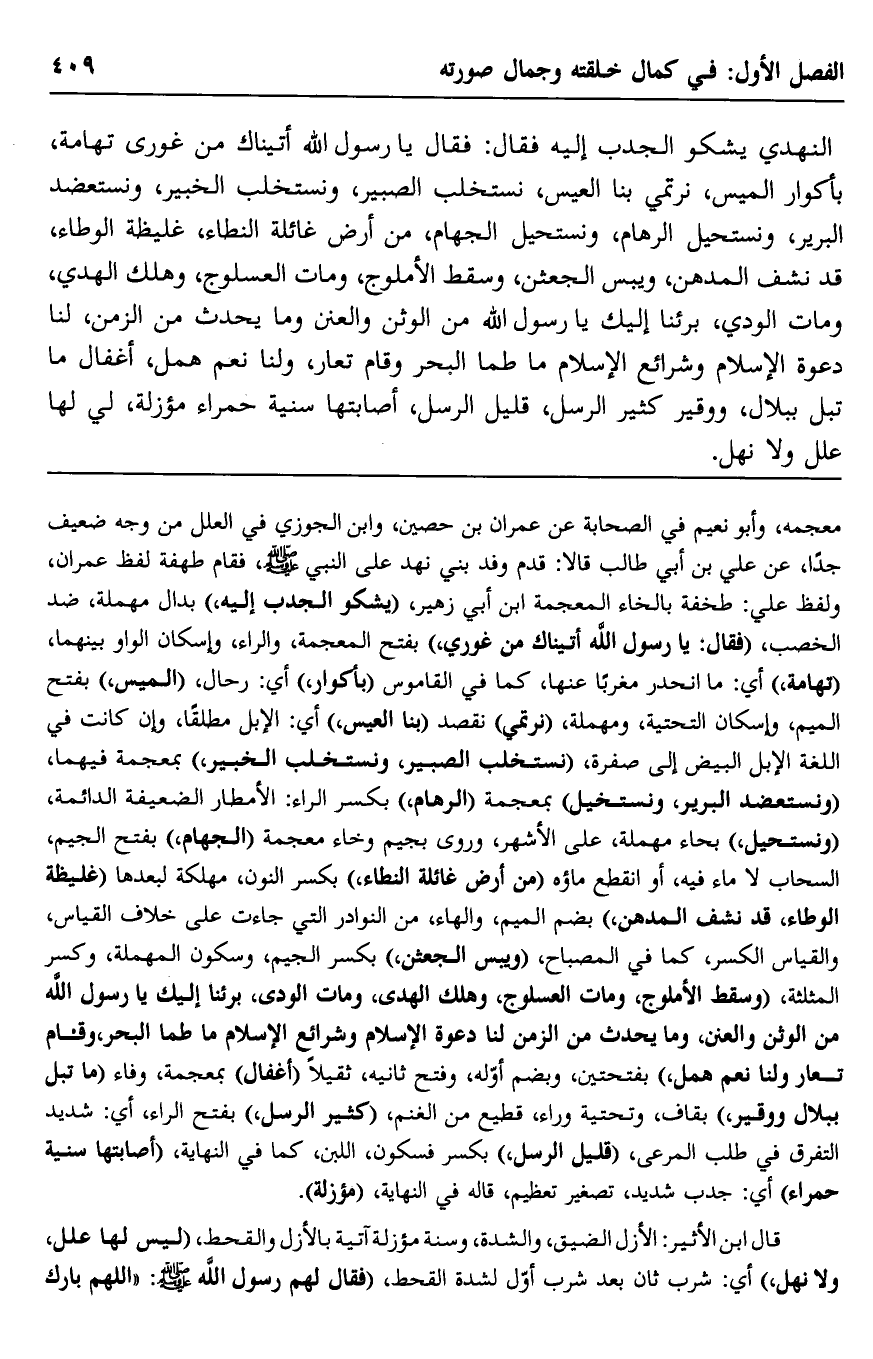 معجمه، وأبو نعيم في الصحابة عن عمران بن حصين، وابن الجوزي في العلل من وجه ضعيف جدًّا، عن علي بن أبي طالب قالا: قدم وفد بني نهد على النبي -صلى الله عليه وسلم، فقام طهفة, لفظ عمران، ولفظ علي: طخفة -بالخاء المعجمة- ابن أبي زهير، "يشكو الجدب إليه" -بدال مهملة- ضد الخصب، "فقال: يا رسول الله أتيناك من غورى" -بفتح المعجمة، والراء، وإسكان الواو بينهما- "تهامة" أي: ما انحدر مغربًا عنها، كما في القاموس "بأكوار"، أي: رحال، "الميس" -بفتح الميم، وإسكان التحتية، ومهملة, "نرتمي" نقصد "بنا العيس"، أي: الإبل مطلقًا، وإن كانت في اللغة: الإبل البيض إلى صفر، "نستخلب الصبير، ونستخلب الخبير" -بمعجمة فيهما- و"نستعضد البرير، ونستخيل" بمعجمة "الرهام" -بكسر الراء: الأمطار الضعيفة الدائمة، و"نستحيل" -بحاء مهملة- على الأشهر، وروي بجيم وخاء معجمة, "الجهام" -بفتح الجيم- السحاب لا ماء فيه، أو انقطع ماؤه, "من أرض غائلة النطاء" -بكسر النون، مهلكة لبعدها, "غليظة الوطاء، قد نشف المدهن" -بضم الميم، والهاء- من النوادر التي جاءت على خلاف القياس، والقياس الكسر، كما في المصباح، "ويبس الجعثن" -بكسر الجيم، وسكون المهملة، وكسر المثلثة، "وسقط الأملوج، ومات العسلوج، وهلك الهدي، ومات الودي، برئنا إليك يا رسول الله من الوثن والعنن، وما يحدث من الزمن, لنا دعوة الإسلام وشرائع الإسلام ما طما البحر، وقام تعار ولنا نعم همل" -بفتحتين وبضم أوله وفتح ثانيه- ثقيلًا "أغفال" بمعجمة- وفاء "ما تبل ببلال ووقير" -بقاف وتحتية وراء- قطيع من الغنم، "كثير الرسل" -بفتح الراء- أي: شديد التفرق في طلب المرعى، "قليل الرسل" -بكسر فسكون- اللبن، كما في النهاية، "أصابتها سنية حمراء" أي: جدب شديد، تصغير تعظيم، قاله في النهاية، "مؤزلة".