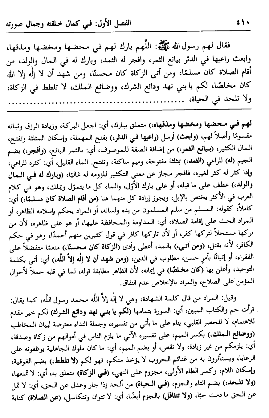 وقيل: المراد من قال كلمة الشهادة، وهي لا إله إلا الله محمد رسول الله، كما يقال: قرأت {حم ?, وَالْكِتَابِ الْمُبِينِ} ، أي: السورة بتمامها, "لكم يا بني نهد ودائع الشرك" لكم خير مقدَّم للاهتمام، لا للحصر القلبي، بناءً على ما يأتي من تفسيره، وجملة النداء معترضة لبيان المخاطب, "ووضائع الملك"، بكسر الميم، على تفسيره الآتي: ما يلزم الناس في أموالهم من زكاة وصدقة، أي: يلزمكم من غير زيادة ولا نقص، أو بضم الميم، أي: ما كان ملوك الجاهلية يوظّفونه على الرعايا، ويستأثرون به من غنائم الحروب, لا يؤخذ منكم، فهو لكم "لا تلطط" -بضم الفوقية، وإسكان اللام، وكسر الطاء الأولى- مجزوم على النهي، "في الزكاة" متعلّق به، أي: لا تمنعها، "ولا تلحد" -بضم التاء والجزم، "في الحياة" , من أَلْحَدَ إذا جارَ وعدل عن الحق، أي: لا تملْ عن الحق ما دمت حيًّا، "ولا تتثاقل" بالجزم أيضًا، أي: لا تتوان وتتكاسل، "عن الصلاة" , كناية
