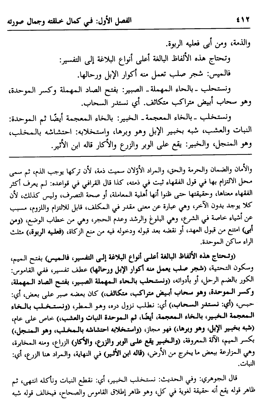 "وتحتاج هذه الألفاظ البالغة أعلى أنواع البلاغة إلى التفسير، فالميس -بفتح الميم، وسكون التحتية، "شجر صلب يعمل منه أكوار الإبل ورحالها" عطف تفسير، ففي القاموس: الكور -بالضم- الرحل، أو بأدواته، "ونستحلب -بالحاء المهملة- الصبير -فتح الصاد المهملة، وكسر الموحدة- وهو سحاب أبيض متراكب، متكاثف"، كأنَّ بعضه صبر على بعض، أي: حبس، "أي: نستدر السحاب"، أي: نطلب نزول دره، وهو المطر، "ونستخلب -بالخاء المعجمة- الخبير -بالخاء المعجمة- أيضًا، ثم الموحدة: النبات والعشب"، خاص على عام، "شبّه بخبير الإبل، وهو وبرها"، فهو مجاز، "واستخلابه احتشاشه بالمخلب، وهو المنجل" بكسر الميم- الآلة المعروفة، "والخبير يقع على الوبر والزرع، والأكار" الزراع، ومنه المخابرة، وهي المزارعة ببعض ما يخرج من الأرض، "قاله ابن الأثير" في النهاية، والمراد هنا الزرع، أي: النبات.