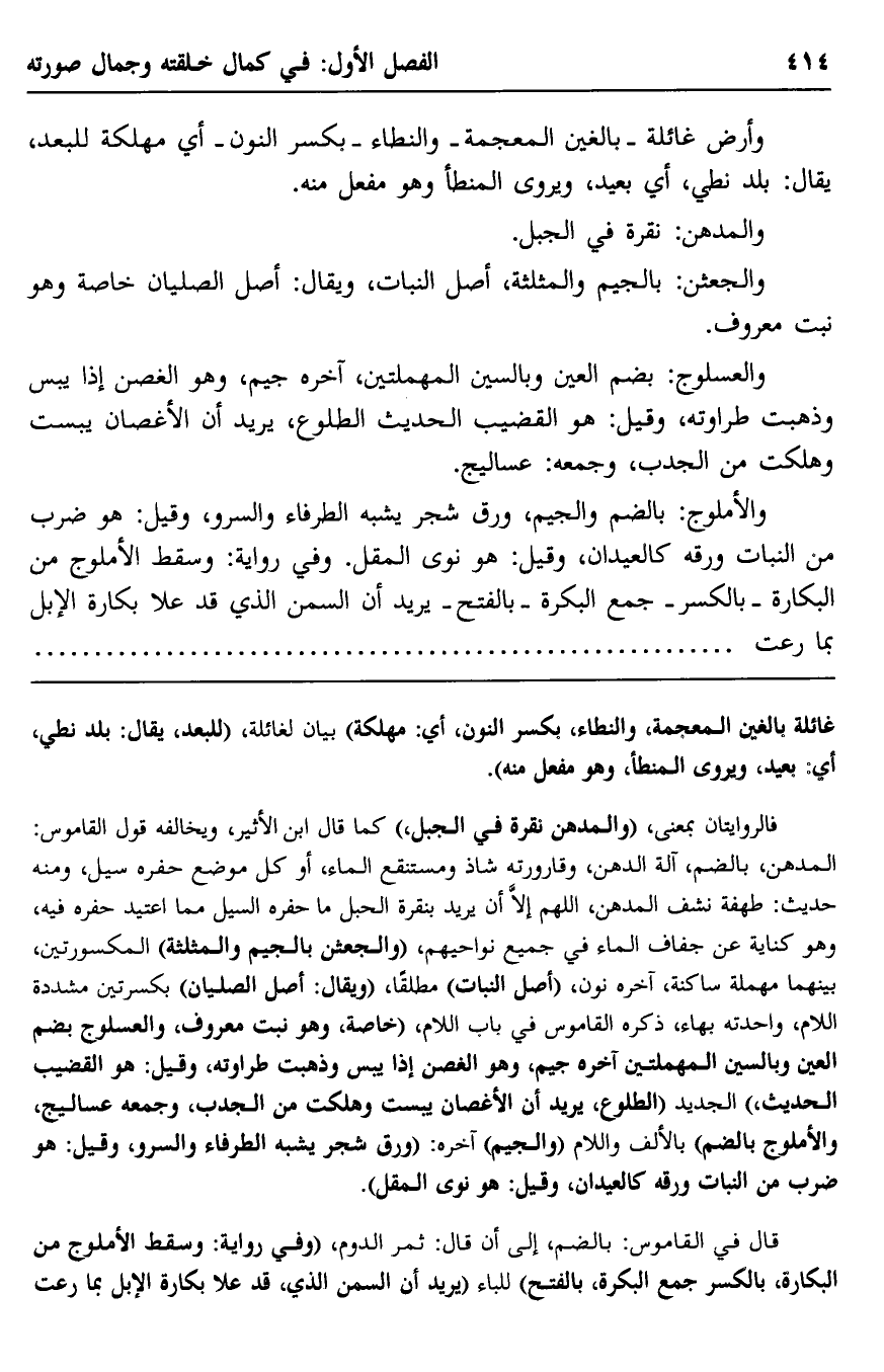 فالروايتان بمعنًى، "والمدهن نقرة في الجبل"، كما قال ابن الأثير، ويخالفه قول القاموس: المدهن -بالضم- آلة الدهن، وقارورته, شاذّ ومستنقع الماء، أو كل موضع حفره سيل، ومنه حديث طهفة: نشف المدهن، اللهمَّ إلا أن يريد بنقرة الجبل ما حفره السيل مما اعتيد حفره فيه، وهو كناية عن جفاف الماء في جميع نواحيهم، "والجعثن -بالجيم والمثلثة" المكسورتين -بينهما مهملة ساكنة آخره نون، "أصل النبات" مطلقًا، "ويقال: أصل الصليان" -بكسرتين مشدَّدة اللام، واحدته بهاء، ذكره القاموس في باب اللام، "خاصَّة, وهو نبت معروف، والعسلوج -بضم العين وبالسين المهملتين، آخره جيم- وهو الغصن إذا يبس وذهبت طراوته، وقيل: هو القضيب الحديث" الجديد "الطلوع، يريد أن الأغصان يبسن وهلكت من الجدب، وجمعه: عساليج، والأملوج -بالضم" بالألف واللام "والجيم" آخره: "ورق شجر يشبه الطرفاء والسرو، وقيل: هو ضرب من النبات ورقه كالعيدان، وقيل: هو نوى المقل".