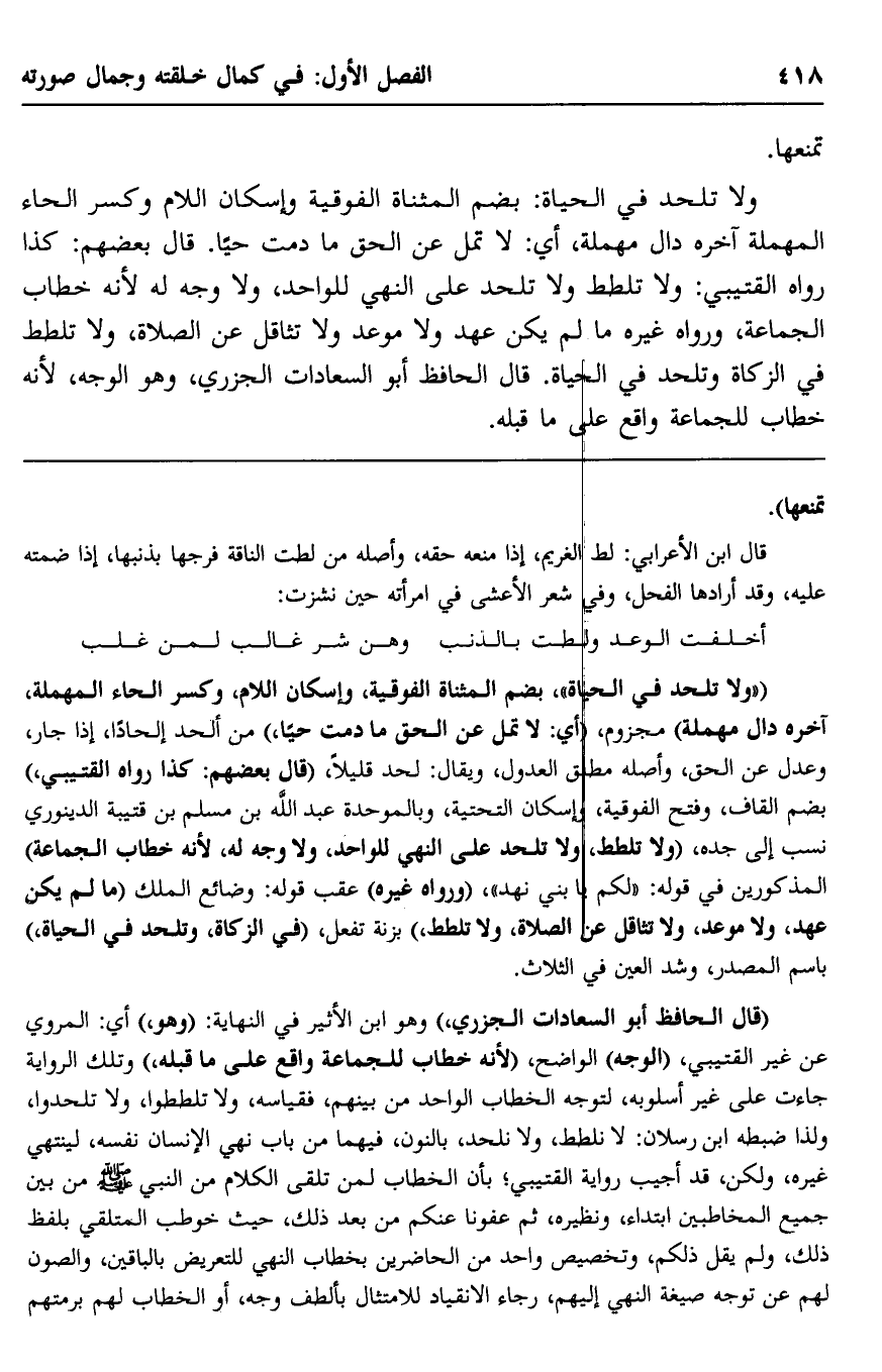"ولا تلحد في الحياة" بضم المثناة الفوقية، وإسكان اللام، وكسر الحاء المهملة، آخره دال مهملة" مجزوم، "أي: لا تمل عن الحق ما دمت حيًّا"، من ألحد إلحادًا، إذا جار وعدل عن الحق، وأصله مطلق العدول، ويقال: لحد قليلًا، "قال بعضهم: كذا رواه القتيبي" بضم القاف، وفتح الفوقية، وإسكان التحتية، وبالموحدة- عبد الله بن مسلم بن قتيبة الدينوري نسب إلى جده، "ولا تلطط، ولا تلحد" على النهي للواحد، ولا وجه له؛ لأنه خطاب الجماعة" المذكورين في قوله: "لكم يا بني نهد"، "ورواه غيره" عقب قوله: "وضائع الملك" , "ما لم يكن عهد ولا موعد، ولا تثاقل عن الصلاة، ولا تلطط"، بزنة تفعل، "في الزكاة، وتلحد في الحياة"، باسم المصدر، وشَدّ العين في الثلاث.