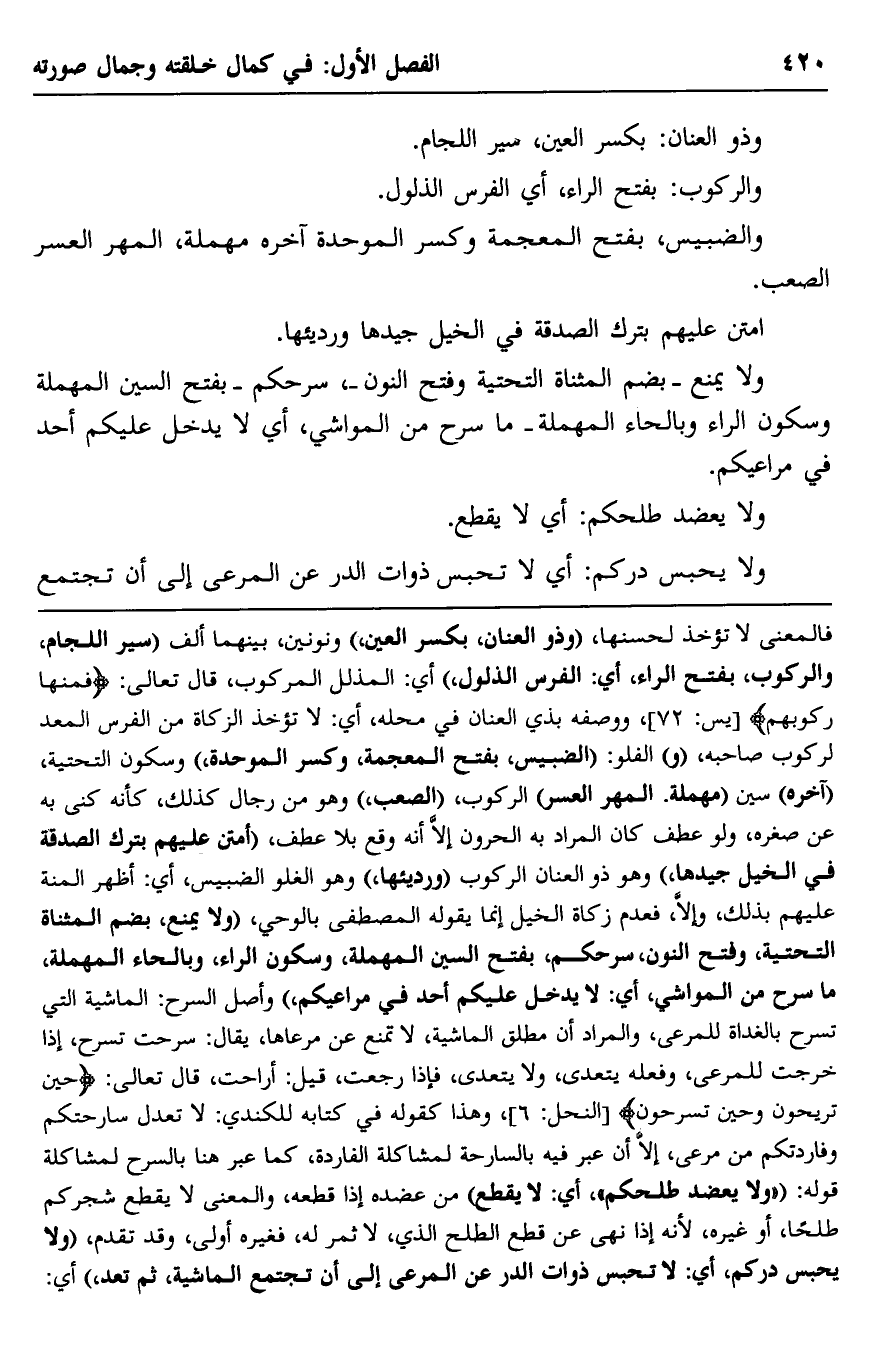 فالمعنى لا تؤخذ لحسنها، "وذو العنان" بكسر العين"، ونونين، بينهما ألف "سير اللجام، "والركوب" بفتح الراء، أي: الفرس الذلول"، أي: المذلَّل المركوب، قال تعالى: {فَمِنْهَا رَكُوبُهُمْ} [يس: 72] ، ووصفه بذي العنان في محله، أي: لا تؤخذ الزكاة من الفرس المعَدّ لركوب صاحبه، "و" الفلوّ: "الضبيس" بفتح المعجمة، وكسر الموحدة، وسكون التحتية، "آخره" سين "مهملة: المهر العسر" الركوب، "الصعب" وهو من رجال كذلك، كأنه كنَّى به عن صغره، ولو عطف كان المراد به الحرون إلّا أنه وقع بلا عطف، "امتَنَّ عليهم بترك الصدقة في الخيل جيدها"، وهو ذو العنان الركوب "ورديئها"، وهو الغلوّ الضبيس، أي: أظهر المنَّة عليهم بذلك، وإلا فعدم زكاة الخيل إنما يقوله المصطفى بالوحي، " "ولا يمنع" -بضم المثناة التحتية، وفتح النون- "سركم" بفتح السين المهملة، وسكون الراء، وبالحاء المهملة، ما سرح من المواشي، أي: لا يدخل عليكم أحد في مراعيكم"، وأصل السرح: الماشية التي تسرح بالغداة للمرعى، والمراد: إن مطلق الماشية لا تمنع عن مرعاها، يقال: سرحت تسرح، إذا خرجت للمراعى، وفعله يتعدَّى ولا يتعدّى، فإذا رجعت، قيل: أراحت، قال تعالى: {حِينَ تُرِيحُونَ وَحِينَ تَسْرَحُونَ} [النحل: 6] ، وهذا كقوله في كتابه للكندي: لا تعدل سارحتكم وفاردتكم من مرعى، إلا أن عبَّر فيه بالساحة لمشاكلة الفاردة، كما عَبَّر هنا بالسرح لمشاكلة قوله: "ولا يعضد طلحكم"، أي: لا يقطع" من عضده إذا قطعه، والمعنى: لا يقطع شجركم طلحًا أو غيره؛ لأنه إذا نهى عن قطع الطلح الذي لا ثمر له، فغيره أولى، وقد تقدَّم، "ولا يحبس دركم، أي: لا تحبس ذوات الدر عن المرعى إلى أن تجتمع الماشية، ثم تعد"، أي: