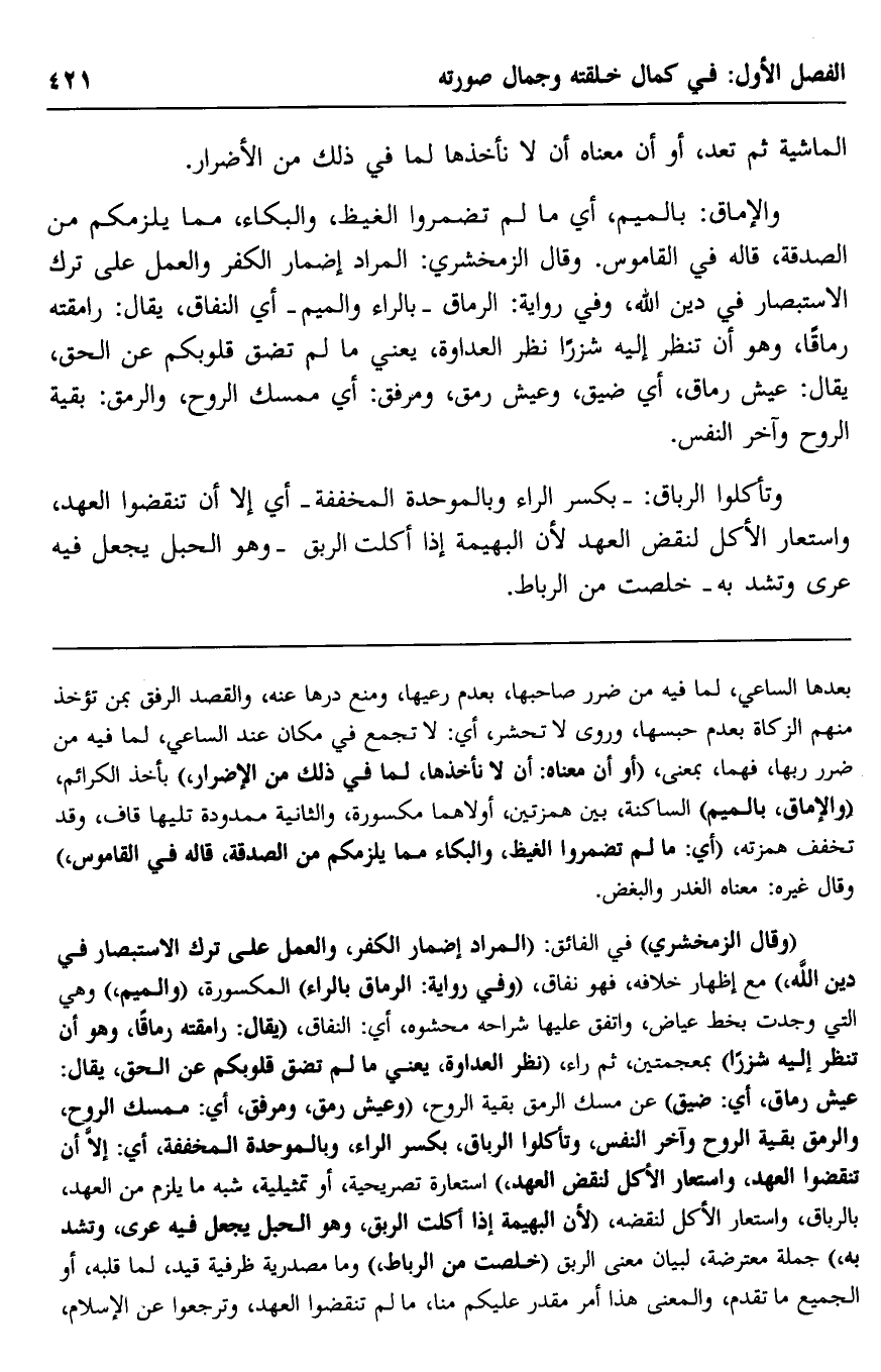 "وقال الزمخشري" في الفائق: "المراد إضمار الكفر، والعمل على ترك الاستبصار في دين الله"، مع إظهار خلافه، فهو نفاق، "وفي رواية: الرماق -بالراء" المكسورة، "والميم"، وهي التي وجدت بخط عياض، واتفق عليها شراحه محشوه، أي: النفاق، "يقال: رامقته رماقًا، وهو أن تنظر إليه شزرًا" بمعجمتين، ثم راء، "نظر العداوة، يعني: ما لم تضق قلوبكم عن الحق، يقال: عيش رماق، أي: ضيق" عن مسك الرمق: بقية الروح، "وعيش رمق، ومرفق، أي: مسك الروح، والرمق بقية الروح وآخر النفس، "وتاكلوا الرباق" بكسر الراء، وبالموحدة المخففة، أي: إلّا أن تنقضوا العهد، واستعار الأكل لنقض العهد"، استعارة تصريحية أو تمثيلية، شبَّه ما يلزم من العهد بالرباق، واستعار الأكل لنقضه؛ "لأن البهيمة إذا أكلت الربق، وهو الحبل يجعل فيه عرى، وتشد به"، جملة معترضة، لبيان معنى الربق "خلصت من الرباط"، وما مصدرية ظرفية قيد لما قبله، أو الجميع ما تقدَّم، والمعنى: هذا أمر مقدَّم عليكم منا، ما لم تنقضوا العهد، وترجعوا عن الإسلام،