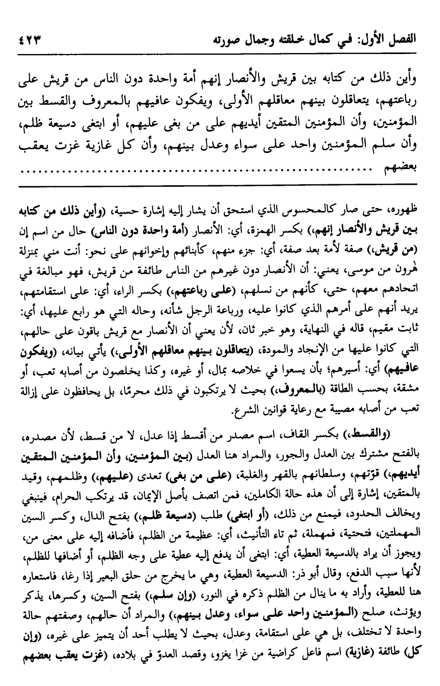 وأين ذلك من كتابه بين قريش والأنصار, إنهم أمّة واحدة دون الناس من قريش على رباعتهم، يتعاقلون بينهم معاقلهم الأولى، ويفكون عافيهم بالمعروف والقسط بين المؤمنين، وأن المؤمنين المتقين أيديهم على من بقى عليهم، أو ابتغى دسيعة ظلم، وأن سلم المؤمنين واحد على سواء وعدل بينهم، وأن كل غازية غزت يعقب بعضهم