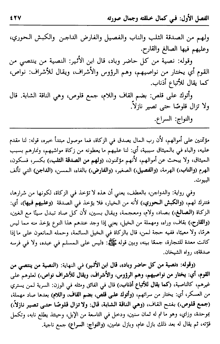 "وقوله: "نصية من كل حاضر وباد"، قال ابن الأثير" في النهاية: "النصية: من ينتصي من القوم، أي: يختار من نواصيهم، وهم الرءوس والأشراف، ويقال للأشراف: نواصٍ"؛ لعلوّهم على غيرهم، كالناصية، "كما يقال للأتباع: أذناب"، قال في الفائق ومثله في الوزن: السرية لمن يستري من العسكر، أي: يختار من سراتهم، "وأتوك على قلص -بضم القاف واللام" بعدها صاد مهملة، "جمع قلوص" بفتح القاف، "وهي الناقة الشابّة، قال: ولا تزال قلوصًا حتى تصير نازلًا" بموحدة وزاي- وهو ما تَمَّ له ثمان سنين ودخل في التاسعة من الإبل، وحينئذ يطلع نابه، وتكمل قوته، ثم يقال له بعد ذلك: بازل عام، وبازل عامين، "والنواج: السراع" جمع ناجية.