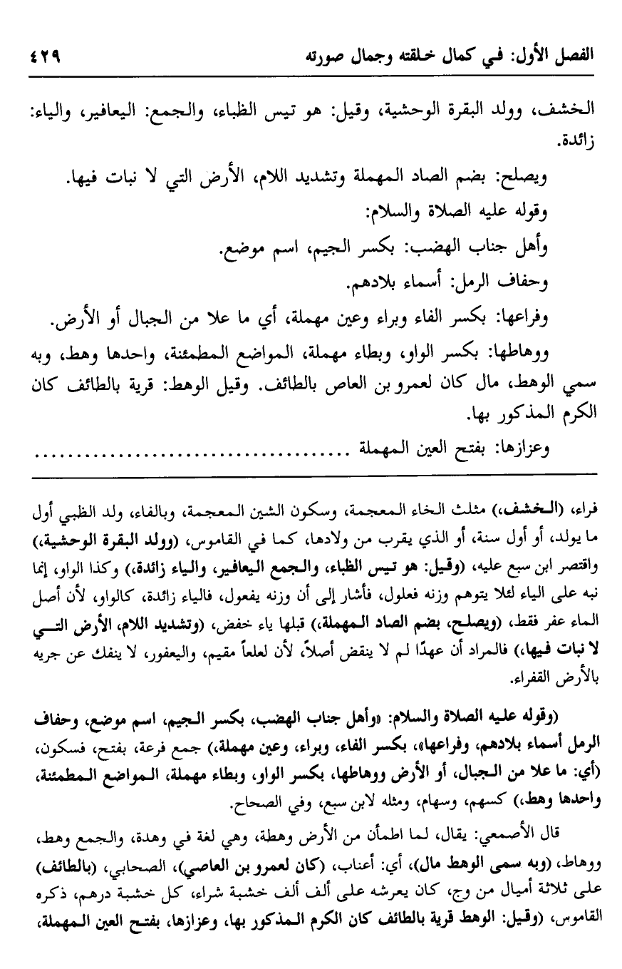 "وقوله -عليه الصلاة والسلام: "وأهل جناب الهضب" بكسر الجيم- اسم موضع، "وحفاف الرمل" أسماء بلادهم، "وفراعها" بكسر الفاء وبراء وعين مهملة" جمع فرعة -بفتح، فسكون- "أي: ما علا من الجبال أو الأرض، "ووهاطها" بكسر الواو، وبطاء مهملة- المواضع المطمئنة، واحدها وهط" كسهم، وسهام، ومثله لابن سبع، وفي الصحاح.