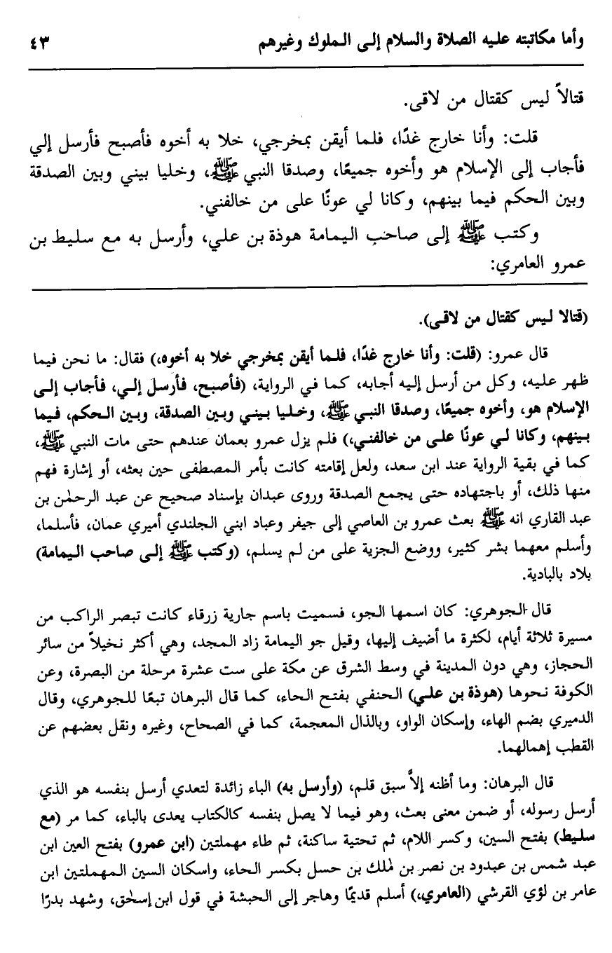قال عمرو: "قلت: وأنا خارج غدًا، فلمَّا أيقن بمخرجي خلا به أخوه"، فقال: ما نحن فيما ظهر عليه، وكل من أرسل إليه أجابه، كما في الرواية، "فأصبح، فأرسل إليّ، فأجاب إلى الإسلام هو وأخوه جميعًا، وصدَّقا النبي -صلى الله عليه وسلم، وخلَّيَا بيني وبين الصدقة, وبين الحكم فيما بينهم، وكانا لي عونًا على من خالفني"، فلم يزل عمرو بعمان عندهم حتى مات النبي -صلى الله عليه وسلم، كما في بقية الرواية عند ابن سعد، ولعلَّ إقامته كانت بأمر المصطفى حين بعثه، أو إشارة فهم منها ذلك، أو باجتهاده حتى يجمع الصدقة, وروى عبدان بإسناد صحيح عن عبد الرحمن بن عبد القاري أنه -صلى الله عليه وسلم- بعث عمرو بن العاص إلى جيفر وعبَّاد ابني الجلندي أميري عمان، فأسلما وأسلم معهما بشر كثير، ووضع الجزية على من لم يسلم، "وكتب -صلى الله عليه وسلم- إلى صاحب اليمامة" بلاد بالبادية.