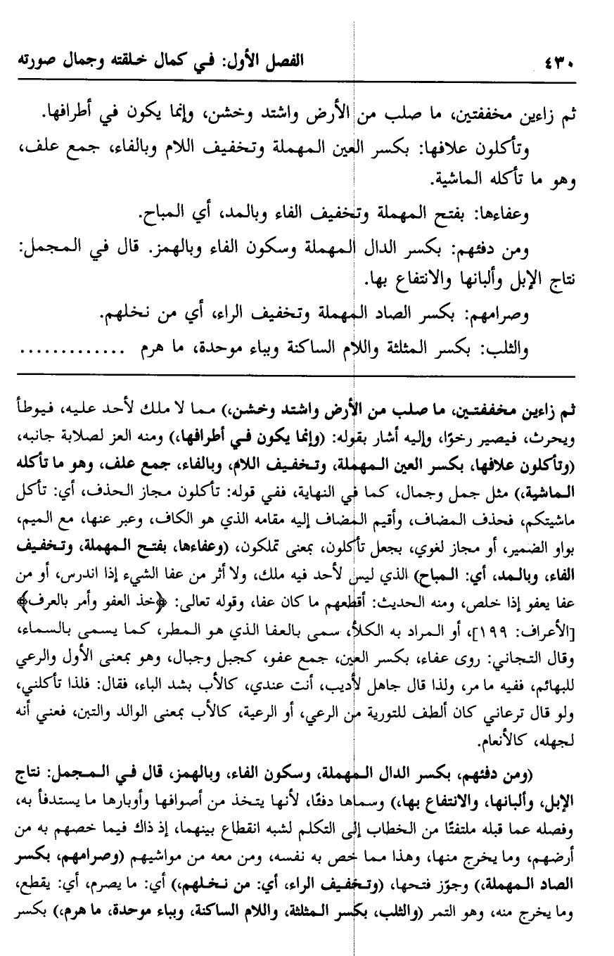 ثم زاءين مخففين- ما صلب من الأرض واشتدَّ وخشن"، مما لا ملك لأحد عليه، فيوطأ ويحرث، فيصير رخوًا، وإليه أشار بقوله: "وإنما يكون في أطرافها"، ومنه العز لصلابة جانبه، "وتأكلون علافها -بكسر العين المهملة، وتخفيف اللام، وبالفاء- جمع علف، وهو ما تأكله الماشية"، مثل: جمل وجمال، كما في النهاية، ففي قوله: تأكلون, مجاز الحذف، أي: تأكل ماشيتكم، فحذف المضاف وأقيم المضاف إليه مقامه الذي هو الكاف، وعَبَّرَ عنها مع الميم بواو الضمير، أو مجاز لغوي بجعل تأكلون، بمعنى: تملكون، "وعفاءها" بفتح المهملة، وتخفيف الفاء، وبالمد- أي: المباح" الذي ليس لأحد فيه ملك، ولا أثر من عفا الشيء إذا اندرس، أو من عفا يعفو إذا خلص، ومنه الحديث: "أقطعهم ما كان عفا"، وقوله تعالى: {خُذِ الْعَفْوَ وَأْمُرْ بِالْعُرْف} [الأعراف: 199] ، أو المراد به: الكلأ، سُمِّيَ بالعفا الذي هو المطر، كما يسمَّى بالسماء، وقال التجاني: روي عفاء -بكسر العين- جمع عفو، كجبل وجبال، وهو بمعنى الأوّل, والرعي للبهائم، ففيه ما مَرَّ، ولذا قال جاهل لأديب، أنت عندي كالأب -بشد الباء، فقال: فلذا تأكلني، ولو قال: ترعاني, كان ألطف للتورية من الرعي أو الرعية، كالأب بمعنى الولد والتبن، فعني أنه لجهله كالأنعام.