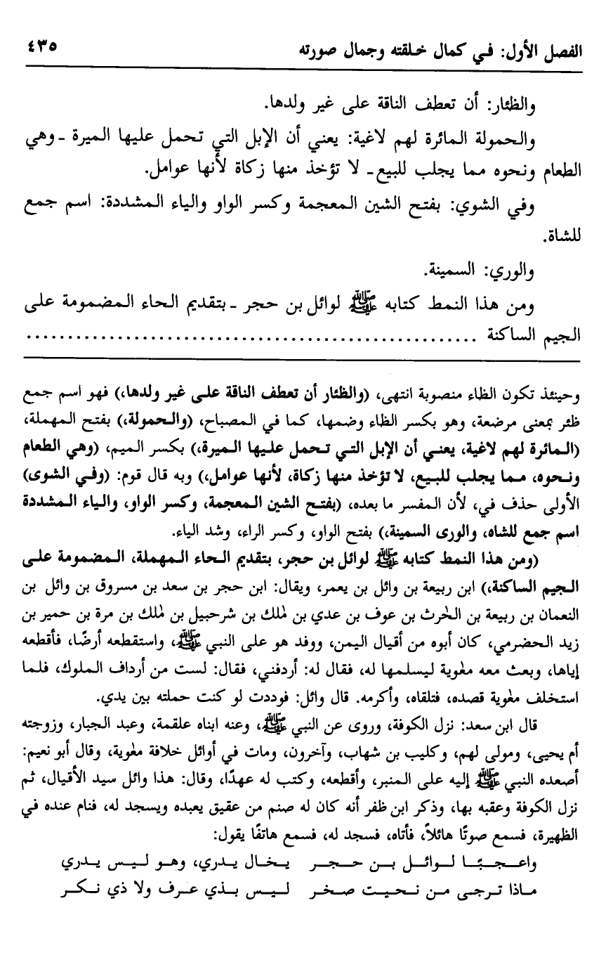 "ومن هذا النمط كتابه -صلى الله عليه وسلم- لوائل بن حجر، بتقديم الحاء المهملة المضمومة على الجيم الساكنة"، ابن ربيعة بن وائل بن يعمر، ويقال: ابن حجر بن سعد بن مسروق بن وائل بن النعمان بن ربيعة بن الحارث بن عوف بن عدي بن مالك بن شرحبيل بن مالك بن مرة بن حمير بن زيد الحضرمي، كانّ أبوه من أقيال اليمن، ووفد هو على النبي -صلى الله عليه وسلم، واستقطعه أرضًا، فأقطعه إياها، وبعث معه معاوية ليسلمها له، فقال له: أردفني، فقال: لست من أرداف الملوك، فلمَّا استخلف معاوية قصده، فتلقاه وأكرمه. قال وائل: فوددت لو كنت حملته بين يدي.