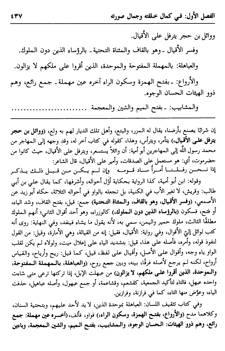 وقوله: ابن أبو أمية، كذا الرواية بحكاية أوّل أحواله وأشرافها، كما يقال: علي بن أبي طالب: وقريش، لا تغير الأب في الكنية، بل تجعله بالواو في أحواله الثلاثة، حكاه أبو زيد عن الأصمعي، "وفسَّر الأقيال، وهو بالقاف، والمثناة التحتية" جمع: قيل -بفتح القاف وشد الياء, أو فتح فسكون "بالرؤساء الذين دون الملوك" كالوزراء، وهو أحد أقوال, الثاني: إنهم الملوك مطلقًا, الثالث: ملوك حمير واليمن، سمي به؛ لأنه يقول ما يشاء فينفد، وفي النهاية: روي أنه كتب لوائل إليّ الأقوال، وفي رواية: الأقيال، فقيل: إنه من القيالة، وهي الأمارة، وقيل: من القول لنفوذ قوله وأمره، فأصله على هذا، قيل: بتشديد الياء على إعلال ميت، ولولاه لم يكن لقلب الواو ياء وجه، وأقوال على الأصل، وأقيال على لفظ، قيل: كما قيل: ريح وأرياح، والقياس أرواح، لكنه لم يرجع لأصله فرقًا بينه وبين جمع روح، "والعباهلة" بالمهملة المفتوحة، والموحدة- الذين أقروا على ملكهم لا يزالون" من عبهلت الإبل إذا تركتها ترعى متى شاءت, واحده عبهل، فالتاء لتأكيد الجمعية، كقشعم، وقشاعمة، أو جمع عبهول، وأصله عباهيل، حذفت الياء، وعوّض منها التاء، كما في فرازنة، وفرازين.