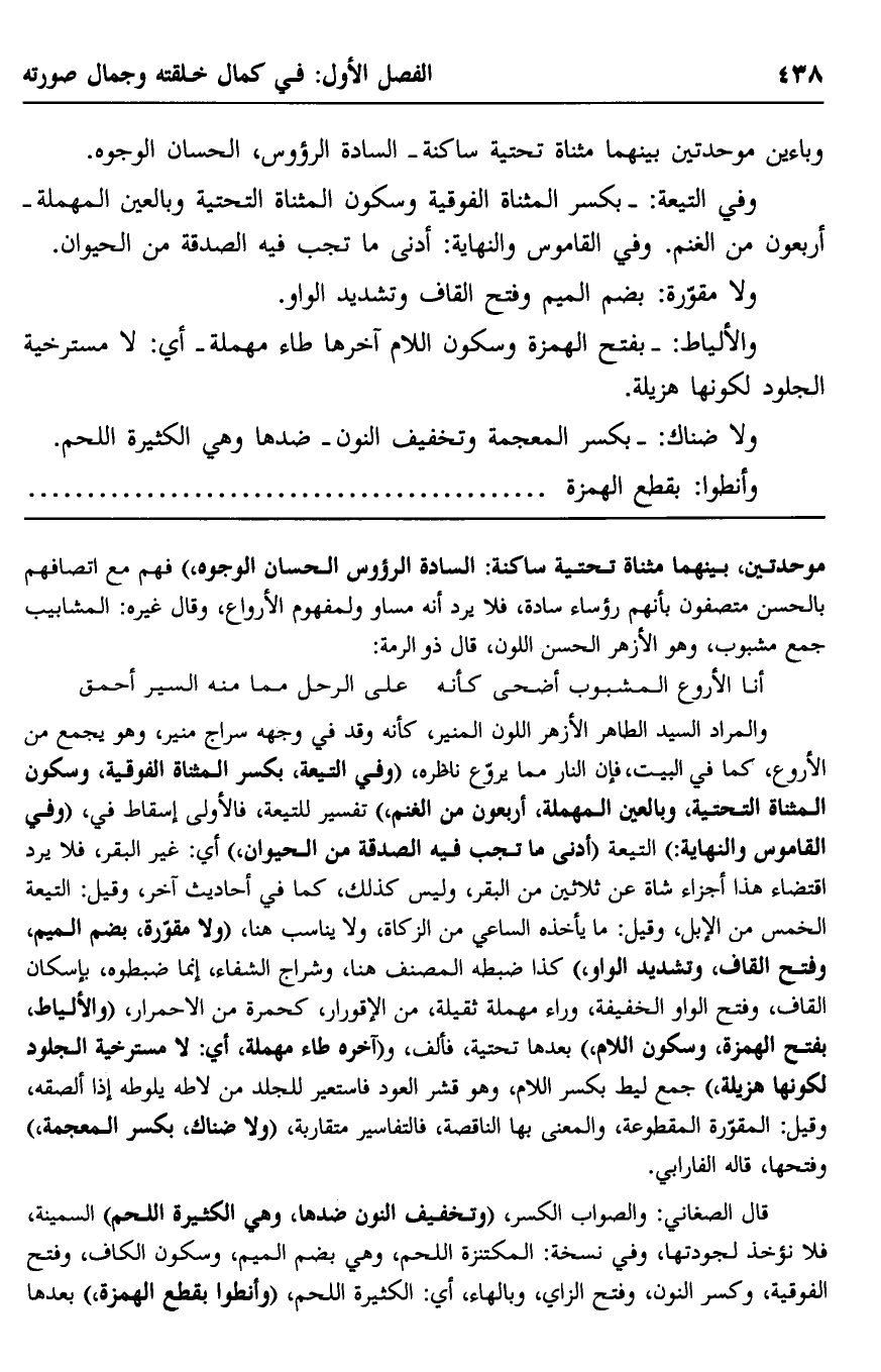 والمراد: السيد الطاهر الأزهر اللون المنير؛ كأنه وقد في وجهه سراج منير، وهو يجمع من الأروع، كما في البيت، فإن النار مما يروع ناظره، "وفي التيعة" بكسر المثناة الفوقية، وسكون المثناة التحتية، وبالعين المهملة- أربعون من الغنم" تفسير للتيعة، فالأولى إسقاط في، "وفي القاموس والنهاية": التيعة "أدنى ما تجب فيه الصدقة من الحيوان"، أي: غير البقر، فلا يرد اقتضاء هذا جزاء شاة عن ثلاثين من البقر، وليس كذلك، كما في أحاديث آخر، وقيل: التيعة الخمس من الإبل، وقيل: ما يأخذه الساعي من الزكاة، ولا يناسب هنا، "ولا مقوّرة" بضم الميم وفتح القاف، وتشديد الواو"، كذا ضبطه المصنف هنا، وشراح الشفاء إنما ضبطوه -بإسكان القاف، وفتح الواو الخفيفة، وراء مهملة ثقيلة- من الإقورار، كحمرة من الاحمرار، "والألياط" بفتح الهمزة، وسكون اللام"، بعدها تحتية، فألف، و"آخره طاء مهملة، أي: لا مسترخية الجلود لكونها هزيلة"، جمع ليط -بكسر اللام، وهو قشر العود, فاستعير للجلد, من لاطه يلوطه إذا ألصقه، وقيل: المقوَّرة المقطوعة، والمعني بها: الناقصة، فالتفاسير متقاربة، "ولا ضناك" بكسر المعجمة"، وفتحها، قاله الفارابي.