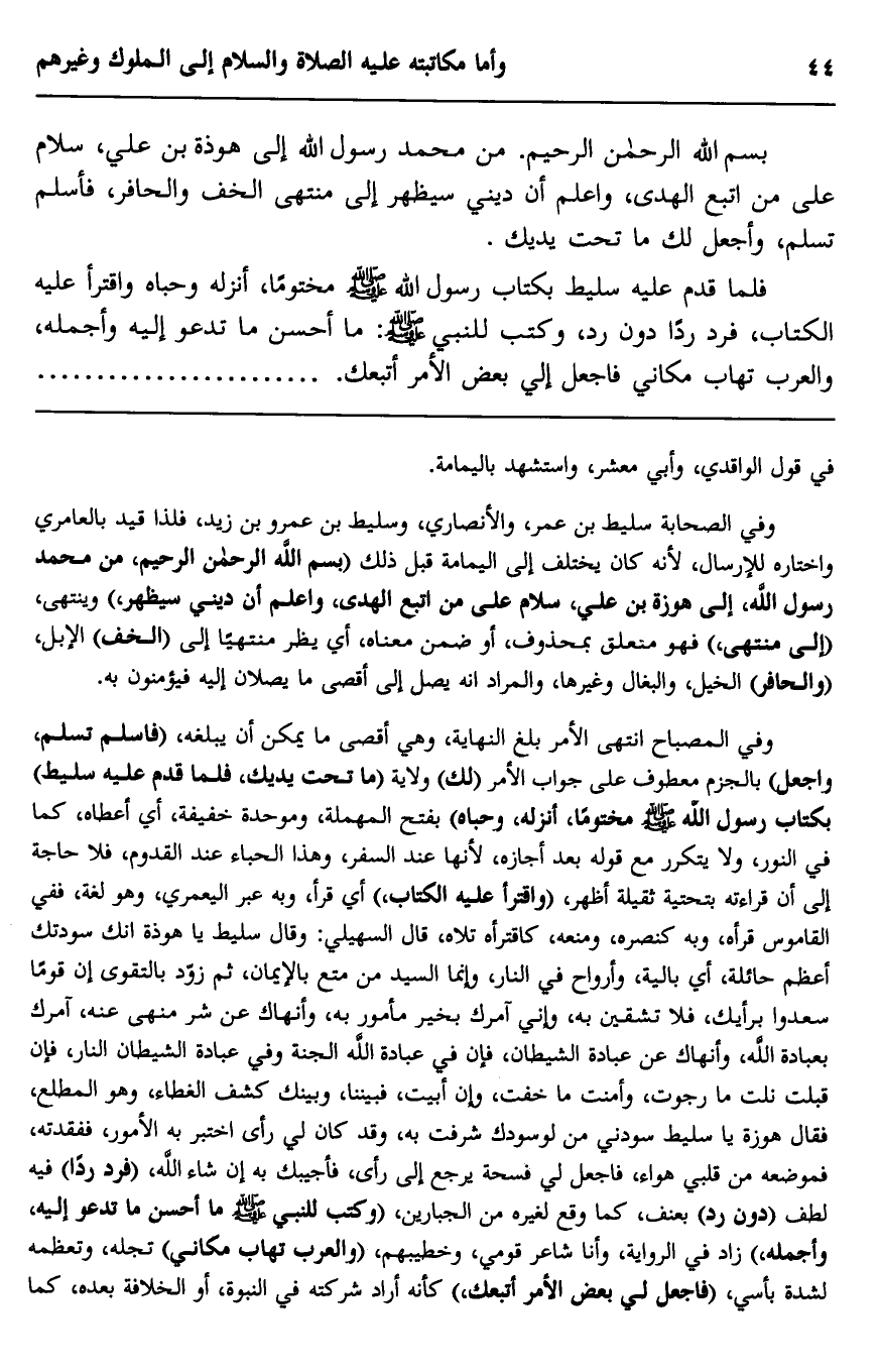 "بسم الله الرحمن الرحيم، من محمد رسول الله إلى هوذة بن علي، سلام على من اتبع الهدى، واعلم أن ديني سيظهر إلى منتهى الخف والحافر، فأسلم تسلم، وأجعل لك ما تحت يديك".