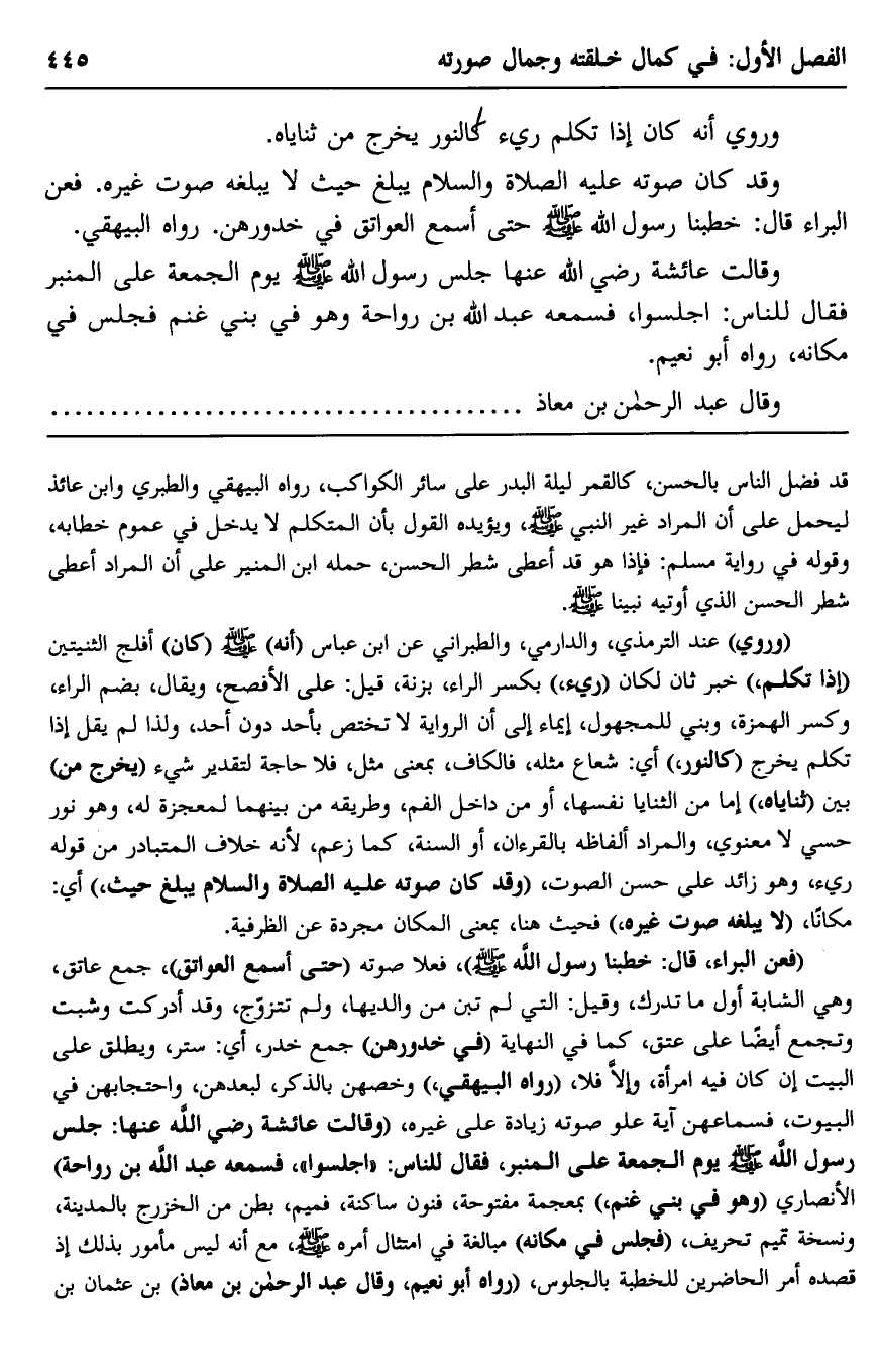 "فعن البراء قال: خطبنا رسول الله -صلى الله عليه وسلم" فعلا صوته "حتى أسمع العواتق" جمع عاتق، وهي الشابّة أوّل ما تدرك، وقيل: التي لم تبن من والديها، ولم تتزوج، وقد أدركت وشبّت, وتجمع أيضًا على عتق، كما في النهاية "في خدورهنَّ" جمع خدر، أي: ستر، ويطلق على البيت إن كان فيه امرأة، وإلّا فلا، "رواه البيهقي"، وخصَّهن بالذكر لبعدهنَّ واحتجابهنَّ في البيوت، فسماعهنَّ آية علوّ صوته زيادة على غيره، "وقالت عائشة -رضي الله عنها: جلس رسول الله -صلى الله عليه وسلم- يوم الجمعة على المنبر، فقال للناس: "اجلسوا" فسمعه عبد الله بن رواحة" الأنصاري "وهو في بني غنم" بمعجمة مفتوحة، فنون ساكنة، فميم- بطن من الخزرج بالمدينة، ونسخة تميم تحريف، "فجلس في مكانه" مبالغةً في امتثال أمره -صلى الله عليه وسلم، مع أنه ليس مأمور بذلك؛ إذ قصده أمره الحاضرين للخطبة بالجلوس، "رواه أبو نعيم، وقال عبد الرحمن بن معاذ" بن عثمان بن