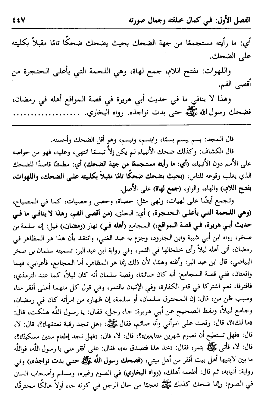 وهذا لا ينافي ما في حديث أبي هريرة في قصة المواقِعِ أهلَه في رمضان، فضحك رسول الله -صلى الله عليه وسلم- حتى بدت نواجذه. رواه البخاري