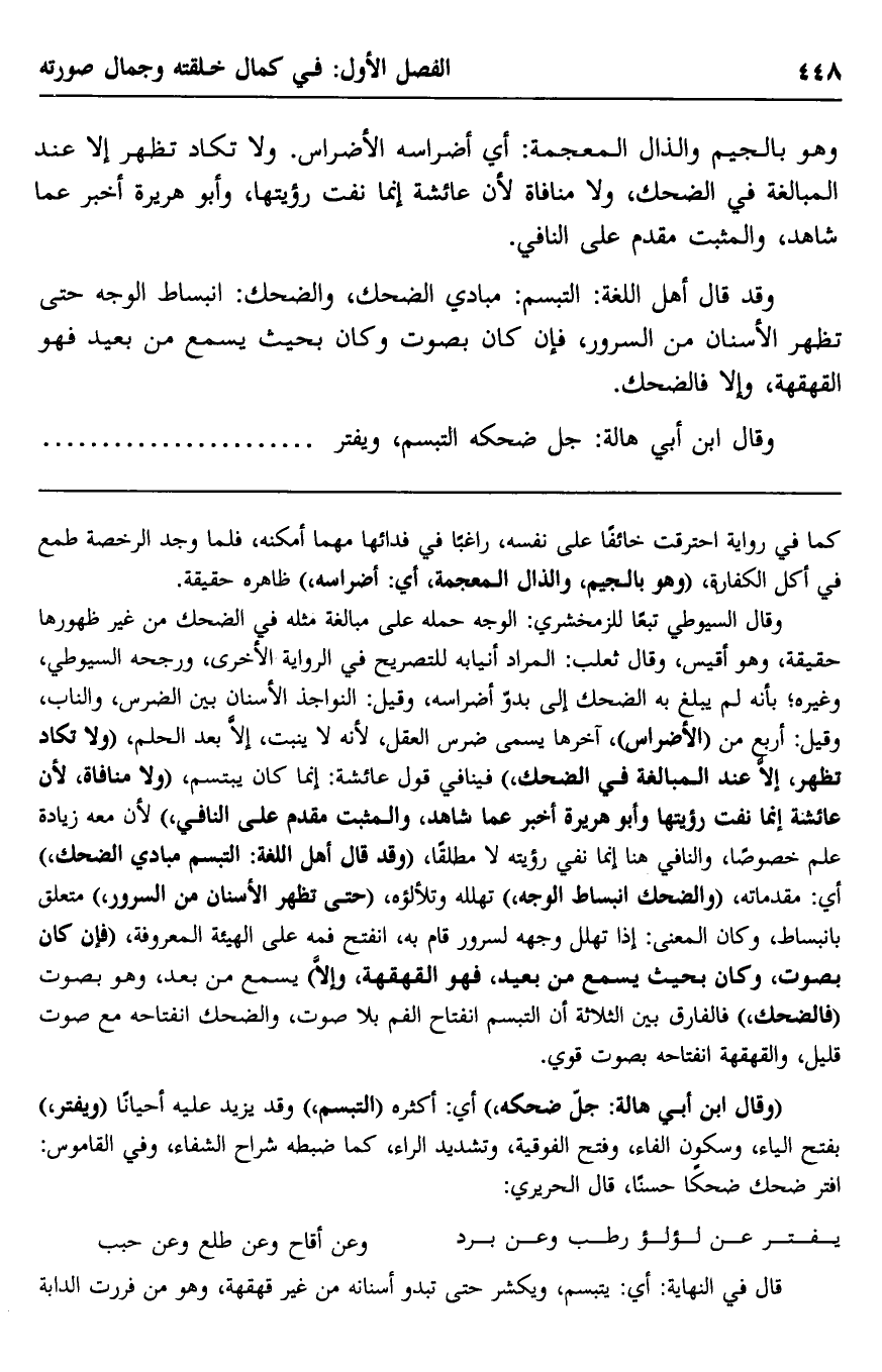"وقال ابن أبي هالة: جلّ ضحكه"، أي: أكثره "التبسّم"، وقد يزيد عليه أحيانًا "ويفتر" بفتح الياء وسكون الفاء وفتح الفوقية وتشديد الراء- كما ضبطه شرَّاح الشفاء، وفي القاموس: افترَّ ضحك ضحكًا حسنًا، قال الحريري: