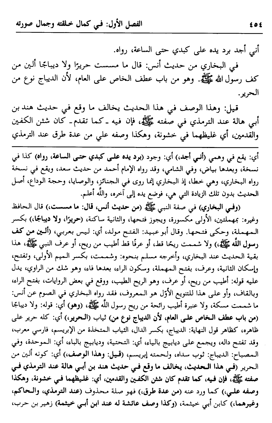 "وفي البخاري" في صفة النبي -صلى الله عليه وسلم "من حديث أنس قال: ما مسست"، قال الحافظ وغيره: بمهملتين: الأولى مكسورة ويجوز فتحها، والثانية ساكنة، "حريرًا، ولا ديباجًا" بكسر المهملة، وحُكِيَ فتحها، وقال أبو عبيد: الفتح مولّد، أي: ليس بعربي، "ألْيَن من كفِّ رسول الله -صلى الله عليه وسلم"، ولا شممت ريحًا قط، أو عرفًا قط أطيب من ريح أو عرف النبي -صلى الله عليه وسلم. هذا بقية الحديث عند البخاري، وأخرجه مسلم بنحوه, وشممت -بكسر الميم الأولى وتفتح، وإسكان الثانية، وعرف -بفتح المهملة، وسكون الراء، بعدها فاء- وهو شكّ من الراوي يدل عليه قوله: أطيب من ريح أو عرف، وهو الريح الطيب، ووقع في بعض الروايات -بفتح الراء، وبالقاف- وأو على هذا للتنويع الأوّل هو المعروف، فقد رواه البخاري في الصوم عن أنس: ما شممت مسكة ولا عنبرة أطيب رائحة من ريح رسول الله -صلى الله عليه وسلم، "وهو" أي: قوله: ولا ديباجًا "من باب عطف الخاصّ على العام؛ لأن الديباج نوع من" ثياب "الحرير"، أي: كله حرير على ظاهره، كظاهر قول النهاية: الديباج -بكسر الدال- الثياب المتَّخذة من الإبريسم، فارسي معرّب، وقد تفتح داله، ويجمع على ديابيج -بالياء- أي: التحتية، ودبابيج -بالباء، أي: الموحدة، وفي المصباح: الديباج: ثوب سداه، ولحمته إبريسم، "قيل: وهذا الوصف"، أي: كونه ألين من الحرير "في هذا الحديث، يخالف ما وقع في حديث هند بن أبي هالة عند الترمذي في صفته -صلى الله عليه وسلم، فإن فيه -كما تقدم: كان شثن الكفين والقدمين، أي: غليظهما في خشونة، وهكذا وصفه علي"، كما ورد عنه "من عدة طرق"، فهو صلة محذوف "عند الترمذي والحاكم وغيرهما" كابن أبي خيثمة، "وكذا وصف عائشة له عند ابن أبي خيثمة" زهير بن حرب،
