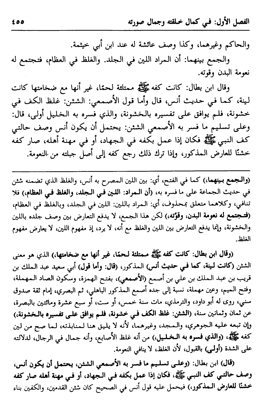 وقال ابن بطال: كانت كفّه -صلى الله عليه وسلم- ممتلئة لحمًا، غير أنها مع ضخامتها كانت لينة، كما في حديث أنس، قال وأمَّا قول الأصمعي: الشثن: غلظ الكف في خشونة، فلم يوافق على تفسيره بالخشونة، والذي فسَّره به الخليل أَوْلَى، قال: وعلى تسليم ما فسَّر به الأصمعي الشثن, يحتمل أن يكون أنس وصف حالتي كف النبي -صلى الله عليه وسلم, فكان إذا عمل بكفه في الجهاد أو في مهنة أهله، صار كفّه خشنًا للعارض المذكور، وإذا ترك ذلك رجع كفه إلى أصل جبلته من النعومة.