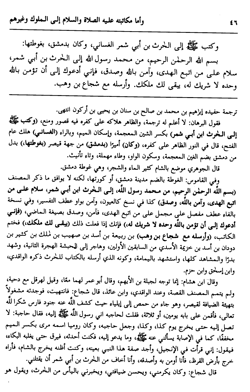 وكتب -صلى الله عليه وسلم- إلى الحارث بن أبي شمر الغساني، وكان بدمشق، بغوطتها: