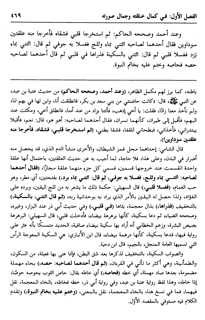 قال الشامي: إحداهما محلّ غمز الشيطان، والأخرى منشأ الدم الذي قد يحصل منه أضرار في البدن، وعلى هذا، فلا حاجة لما أجيب به عن حديث العلقتين، باحتمال أنها علقة واحدة انقسمت عند خروجها قسمين، فسمِّي كل جزء منهما علقة مجازًا، "فقال أحدهما لصاحبه: "ائتني بماء وثلج، فغسلا به جوفي، ثم قال: ائتني بماء برد" بفتحتين- أي: مطر، وهو حب الغمام، "فغسلا قلبي"، قال السهيلي: حكمة ذلك ما يشعر به من ثلج اليقين وبرده على الفؤاد، ولذا حصل له اليقين بالأمر الذي يراد به بواحدنية ره، "ثم قال: ائتني بالسكينة" بالتخفيف, "فذراها" بذال معجمة- بثَّاها "في قلبي"، وفي حديث أبي ذر عند البزار، وغيره، وصحَّحه الضياء: "ثم دعا بسكينة، كأنها برهرهة بيضاء، فأدخلت قلبي"، قال السهيلي: البرهرهة بصيص البشرة، وزعم الخطابي أنه أراد بها سكينة بيضاء صافية، الحديد متمسكًا بأنه عثر على رواية فيها: "فدعا بسكينة كأنها درهمة بيضاء"، قال ابن الأنباري: هي السكينة المعوجّة الرأس التي تسميها العامّة المنجل -بالجيم, قال ابن دحية.