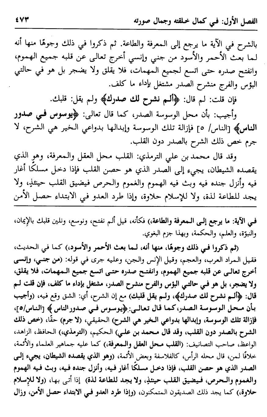 "ثم ذكروا في ذلك وجوهًا منها: أنه لما بعث الأحمر والأسود"، كما في الحديث، فقيل: المراد العرب والعجم، وقيل: الإنس والجن، وعليه جرى في قوله: "من جنىّ وإنسي, أخرج تعالى عن قلبه جميع الهموم، وانفتح صدره حتى اتَّسع جميع المهمات، فلا يقلق ولا يضجر، بل هو في حالتي البؤس والفرح منشرح الصدر، مشتغل بأداء ما كُلِّف، فإن قلت: لم قال: {أَلَمْ نَشْرَحْ لَكَ صَدْرَكَ} ، ولم يقل: قلبك" مع إن الشرح، أي: الشق وقع فيه، "أجيب بأن محلّ الوسوسة الصدر، كما قال تعالى: {يُوَسْوِسُ فِي صُدُورِ النَّاسِ} [الناس: 5] فإزالة تلك الوسوسة وإبدالها بدواعي الخير هي الشرح" الحقيقي، "لا جرم" حقًّا، "خص ذلك الشرح بالصدر دون القلب، وقد قال محمد بن علي" الحكيم، "الترمذي"، الحافظ، الزاهد، الواعظ، صاحب التصانيف: "القلب محل العقل والمعرفة"، كما عليه جماهير العلماء والأئمة، خلافًا لمن قال: محله الرأس، كالفلاسفة وبعض الأئمة، "وهو الذي يقصده الشيطان، يجيء إلى الصدر الذي هو حصن القلب، فإذا دخل مسلكًا أغار فيه، وأنزل جنده فيه، وبثَّ فيه الهموم والغموم والحرص، فيضيق القلب حينئذ، ولا يجد للطاعة لذة" إذا أتى بها، "ولا للإسلام حلاوة"، كما يجد ذلك الصديقون المتمكنون، "وإذا طرد العدو في الابتداء حصل الأمن، وزال
