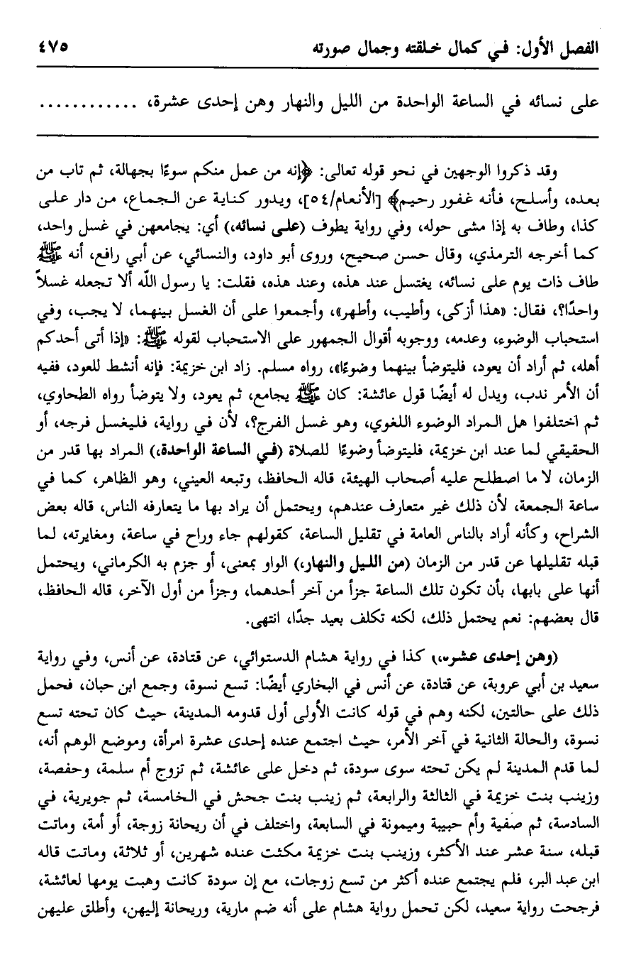 "وهنَّ إحدى عشرة" كذا في رواية هشام الدستوائي عن قتادة، عن أنس، وفي رواية سعيد بن أبي عروبة، عن قتادة، عن أنس في البخاري أيضًا: تسع نسوة، وجمع ابن حبَّان، فحمل ذلك على حالتين، لكنه وَهِمَ في قوله: كانت الأولى أوّل قدومه المدينة؛ حيث كان تحته تسع نسوة، والحالة الثانية في آخر الأمر؛ حيث اجتمع عنده إحدى عشرة امرأة، وموضع الوهم أنه لما قدم المدينة لم يكن تحته سوى سودة، ثم دخل على عائشة، ثم تزوّج أم سلمة، وحفصة، وزينب بنت خزيمة في الثالثة والرابعة، ثم زينب بنت جحش في الخامسة، ثم جويرية في السادسة، ثم صفية وأم حبيبة وميمونة في السابعة، واختلف في أنّ ريحانة زوجة، أو أمة وماتت قبله سنة عشر عند الأكثر، وزينب بنت خزيمة مكثت عنده شهرين أو ثلاثة وماتت, قاله ابن عبد البر، فلم يجتمع عنده أكثر من تسع زوجات، مع أنَّ سودة كانت وهبت يومها لعائشة، فرجحت رواية سعيد، لكن تحمل رواية هشام على أنه ضمّ مارية وريحانة إليهنَّ، وأطلق عليهن