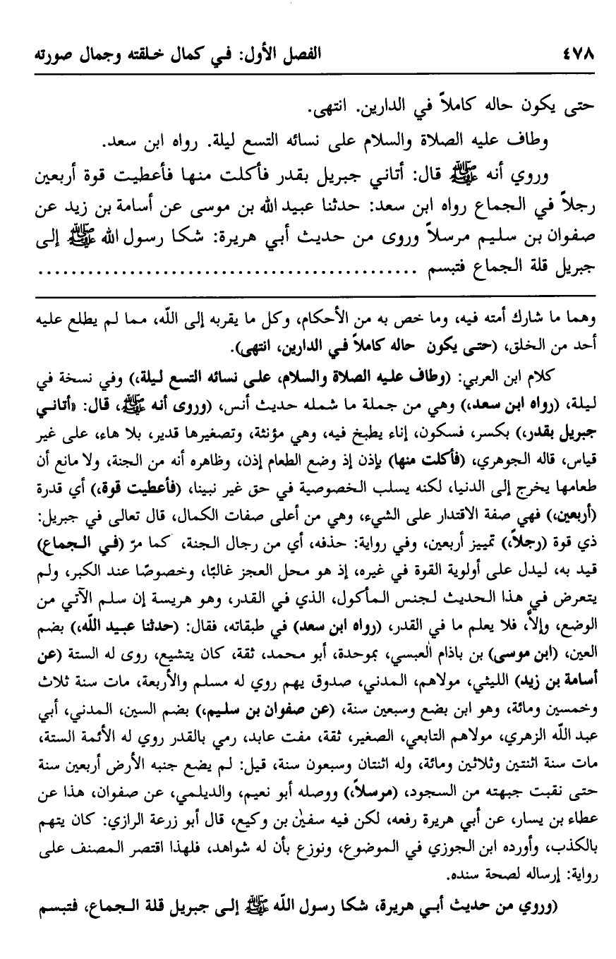 كلام ابن العربي: "وطاف -عليه الصلاة والسلام- على نسائه التسع ليلة"، وفي نسخة: في ليلة، "رواه ابن سعد"، وهي من جملة ما شمله حديث أنس، "وروي أنه -صلى الله عليه وسلم- قال: "أتاني جبريل بقدر" بكسر فسكون- إناء يطبخ فيه، وهي مؤنَّثة، وتصغيرها قدير بلا هاء، على غير قياس، قاله الجوهري. "فأكلت منها" بإذن؛ إذ وضع الطعام إذن، وظاهره أنه من الجنة، ولا مانع أن طعامها يخرج إلى الدنيا، لكنَّه يسلب الخصوصية في حق غير نبينا، "فأعطيت قوة" أي: قدرة "أربعين" , فهي صفة الاقتدار على الشيء، وهي من أعلى صفات الكمال، قال تعالى في جبريل: {ذِي قُوَّةٍ} "رجلًا"، تمييز أربعين، وفي رواية: حذفه، أي: من رجال الجنة، كما مَرًَّ, "في الجماع" قيد به؛ ليدل على أولوية القوة في غيره؛ إذ هو محل العجز غالبًا، وخصوصًا عند الكبر، ولم يتعرّض في هذا الحديث لجنس المأكول الذي في القدر، وهو هريسة إن سلم الآتي من الوضع، وإلا، فلا يعلم ما في القدر، "رواه ابن سعد" في طبقاته، فقال: "حدثنا عبيد الله" بضم العين، "ابن موسى"، بن باذام العبسي -بموحدة- أبو محمد، ثقة، كان يتشيع، روى له الستة, "عن أسامة بن زيد" الليثي، مولاهم، المدني، صدوق, يهم, روي له مسلم والأربعة، مات سنة ثلاث وخمسين ومائة، وهو ابن بضع وسبعين سنة، "عن صفوان بن سليم" بضم السين، المدني، أبي عبد الله الزهري، مولاهم التابعي الصغير، ثقة، مفت عابد، رمي بالقدر روى له الأئمة الستة، مات سنة اثنتين وثلاثين ومائة، وله اثنتان وسبعون سنة، قيل: لم يضع جنبه الأرض أربعين سنة حتى نقبت جبهته من السجود، "مرسلًا"، ووصله أبو نعيم، والديلمي، عن صفوان، هذا, عن عطاء بن يسار، عن أبي هريرة رفعه، لكن فيه سفيان بن وكيع، قال أبو زرعة الرازي: كان يُتَّهم بالكذب، وأورده ابن الجوزي في الموضوع، ونوزع بأن له شواهد، فلهذا اقتصر المصنف على رواية إرساله لصحة سنده.