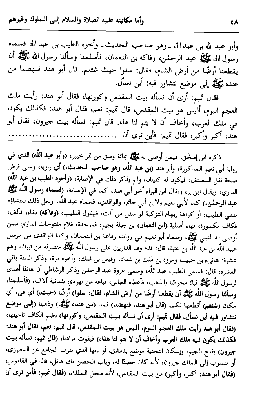 ذكره ابن إسحاق فيمن أوصى له -صلى الله عليه وسلم- بمائة وسق من تمر خيبر، "وأبو عبد الله" الذي في رواية أبي نعيم المذكورة، وأبو هند "بن عبد الله، وهو صاحب الحديث"، أي: راوية، وعلى فرض صحة نقل المصنف، فيكون له كنيتان، ولم يذكر ذلك في الإصابة، "وأخوه الطيب بن عبد الله" الداري، ويقال: ابن بر، ويقال: ابن البراء أخو أبي هند، كما في الإصابة، "فسمَّاه رسول الله -صلى الله عليه وسلم- عبد الرحمن" كما لأبي نعيم ولابن أبي حاتم، والواقدي، فسماه: عبد الله، ولعلَّ ذلك للتشاؤم بنفي الطيب، أو كراهة إيهام التزكية لو سئل من أنت، فيقول الطيب، "وفاكه" بفاء، فألف، فكاف مكسورة، فهاء أصلية "ابن النعمان" بن جبلة -بجيم، فموحدة، فلام مفتوحات- الداري, ممن أوصى له النبي -صلى الله عليه وسلم، وسماه أبو نعيم في روايته رفاعة بن النعمان، وكذا الواقدي من مرسل عبيد الله بن عبد الله بن عتبة، قال: قدم وفد الداريين على رسول الله -صلى الله عليه وسلم- منصرفه من تبوك، وهم عشرة: هانئ بن حبيب وعروة بن مالك بن شداد، وقيس بن مالك، وأخوه مرة، وذكر الستة باقي العشرة، قال: فسمى الطيب عبد الله، وسمى عروة عبد الرحمن, وذكر الرشاطي أن هانئًا أهدى لرسول الله -صلى الله عليه وسلم- قباء مخوصًا بالذهب، فأعطاه العباس، فباعه من يهودي بثمانية آلاف، "فأسلمنا، وسألنا رسول الله -صلى الله عليه وسلم- أن يقطعنا أرضًا من أرض الشام، فقال: "سلوا" أرضا "حيث"، أي: في أي مكان "شئتم" أقطعها لكم، "قال أبو هند: فنهضنا" قمنا "من عنده -صلى الله عليه وسلم"، وذهبنا "إلى موضع نتشاور فيه أين نسأل، فقال تميم: أرى أن نسأله بيت المقدس وكورتها" بضمّ الكاف: ناحيتها، "فقال أبو هند: رأيت ملك العجم اليوم، أليس هو بيت المقدس، قال تميم: نعم، فقال أبو هند: فكذلك يكون فيه ملك العرب, وأخاف أن لا يتمّ لنا هذا"، فيفوت مرادنا، "قال تميم: نسأله بيت جيرون" بفتح الجيم، وإسكان التحتية موضع بدمشق، أو بابهها الذي بقرب الجامع عن المطرزي، أو منسوب إلى الملك جيرون؛ لأنه كان حصنًا له، وباب الحصن باقٍ هائل، قاله في القاموس، "فقال أبو هند: أكبر وأكبر" من بيت المقدس؛ لأنه محل الملك، "فقال تميم: فأين ترى أن