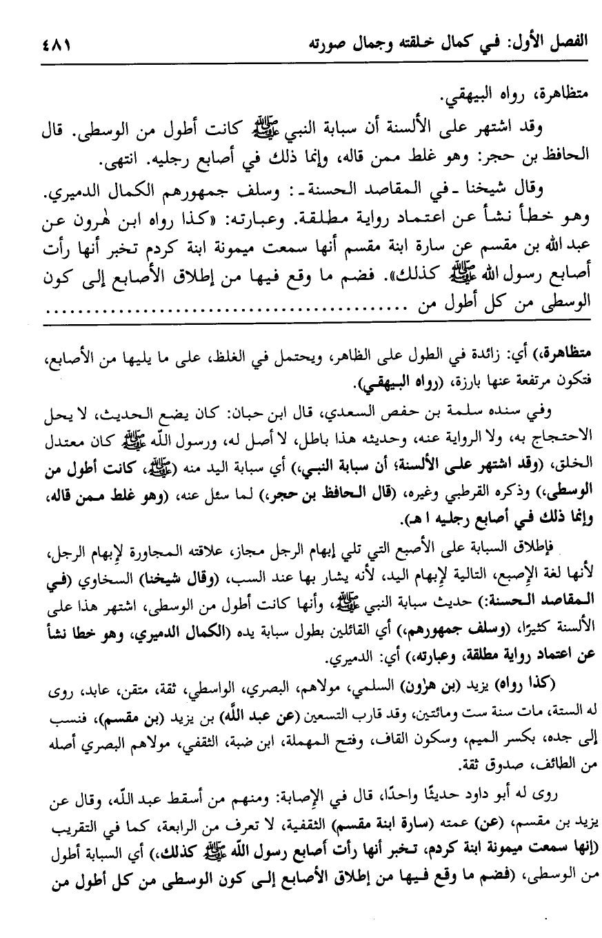 وقال شيخنا -في المقاصد الحسنة: وسلف جمهورهم الكمال الدميري. وهو خطأ نشأ عن اعتماد رواية مطلقة. وعبارته: "كذا رواه ابن هارون عن عبد الله بن مقسم, عن سارة ابنة مقسم, أنها سمعت ميمونة ابنة كردم, تخبر أنها رأت أصابع رسول الله -صلى الله عليه وسلم- كذلك" فضمَّ ما وقع فيها من إطلاق الأصابع إلى كَوْن الوسطى من كل أطول من