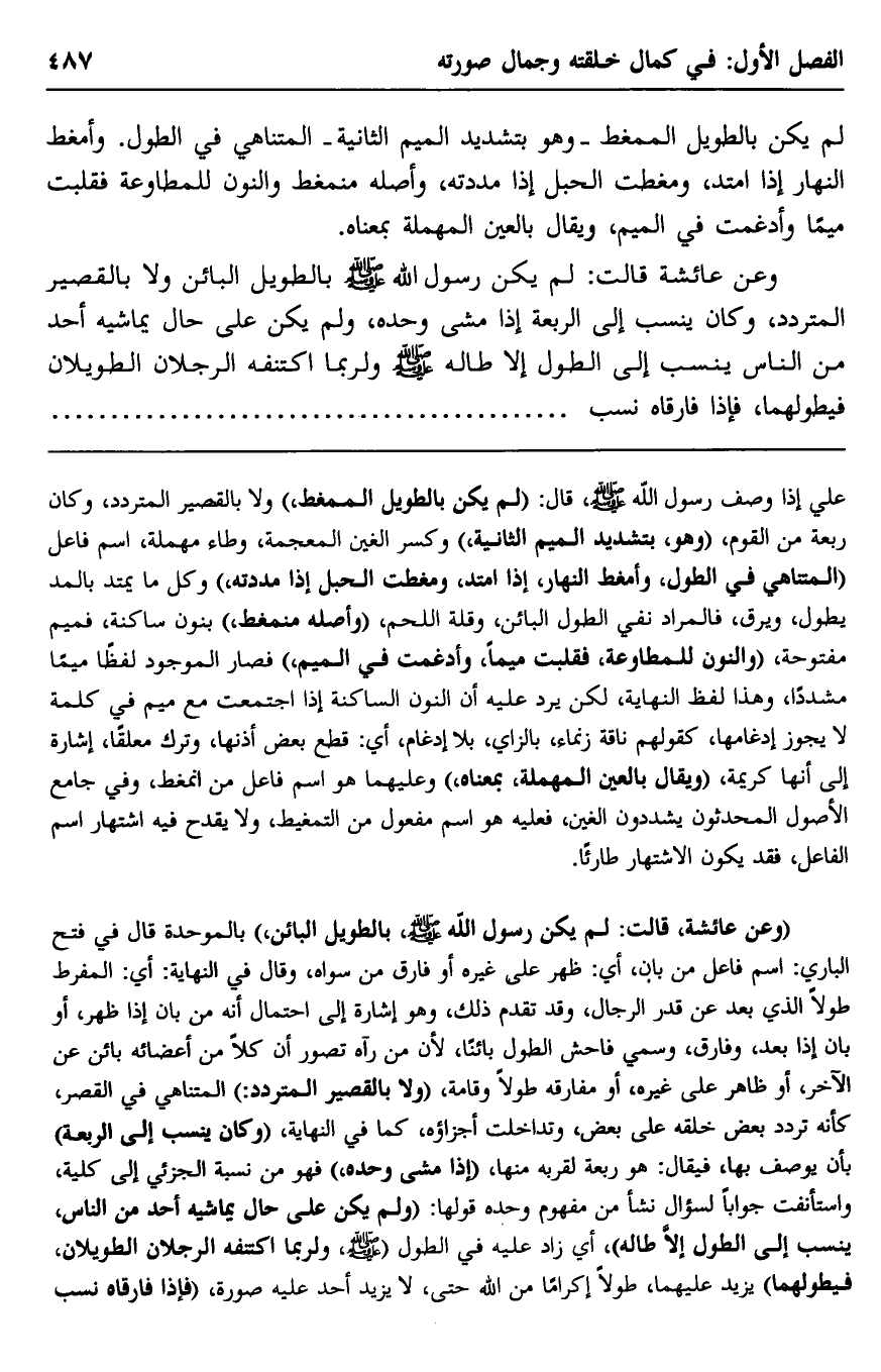 علي إذا وصف رسول الله -صلى الله عليه وسلم- قال: "لم يكن بالطويل الممغط" ولا بالقصير المتردد، وكان ربعة من القوم، "وهو بتشديد الميم الثانية" وكسر الغين المعجمة وطاء مهملة- اسم فاعل "المتناهي في الطول، وأمغط النهار إذا امتدَّ، ومغطت الحبل إذا مددته"، وكل ما يمتد بالمد يطول ويرق، فالمراد نفي الطول البائن وقلة اللحم، "وأصله: منمغط" بنون ساكنة فميم مفتوحة، "والنون للمطاوعة فقلبت ميمًا وأدغمت في الميم"، فصار الموجود لفظًا ميمًا مشددًا، وهذا لفظ النهاية، لكن يرد عليه أن النون الساكنة إذا اجتمعت مع ميم في كلمة لا يجوز إدغامها، كقولهم: ناقة زنماء -بالزاي بلا إدغام، أي: قطع بعض أذنها وتُرِكَ معلقًا، إشارة إلى أنها كريمة، "ويقال بالعين المهملة، بمعناه"، وعليهما: هو اسم فاعل من انمغط، وفي جامع الأصول: المحدثون يشدِّدون الغين، فعليه هو اسم مفعول من التمغيط، ولا يقدح فيه اشتهار اسم الفاعل، فقد يكون الاشتهار طارئًا.