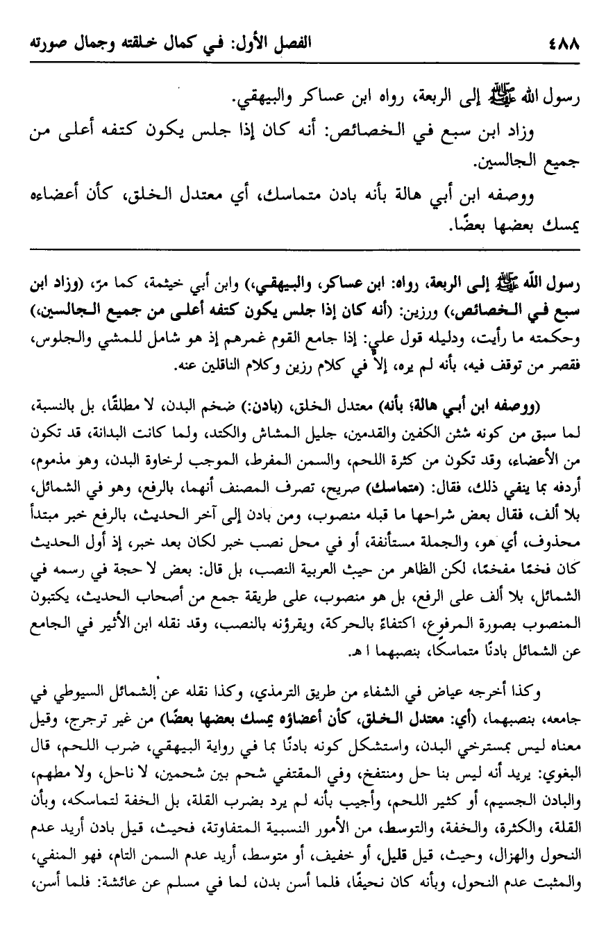 "ووصفه ابن أبي هالة بأنه" معتدل الخلق، "بادن" ضخم البدن، لا مطلقًا، بل بالنسبة لما سبق من كونه شثن الكفين والقدمين، جليل المشاش والكتد، ولما كانت البدانة, قد تكون من الأعضاء، وقد تكون من كثرة اللحم والسمن المفرط المواجب لرخاوة البدن، وهو مذموم، أردفه بما ينفي ذلك، فقال: "متماسك" صريح، تصرف المصنف أنهما بالرفع، وهو في الشمائل بلا ألف، فقال بعض شراحها: ما قبله منصوب، ومن بادن إلى آخر الحديث بالرفع خبر مبتدأ محذوف، أي: هو، والجملة مستأنفة، أو في محل نصب خبر لكان بعد خبر؛ إذ أوّل الحديث: كان فخمًا مفخمًا، لكن الظاهر من حيث العربية النصب، بل قال: بعض لا حجة في رسمه في الشمائل بلا ألف على الرفع بل هو منصوب، على طريقة جمع من أصحاب الحديث، يكتبون المنصوب بصورة المرفوع اكتفاءً بالحركة، ويقرؤنه بالنصب، وقد نقله ابن الأثير في الجامع عن الشمائل بادانًا متماسكًا، بنصبهما أ. هـ.