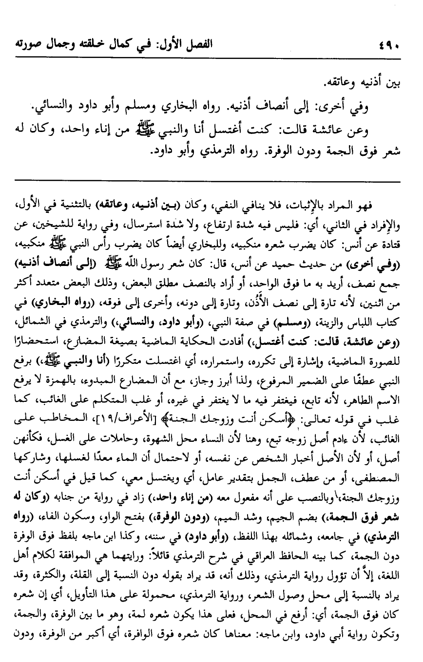 فهو المراد بالإثبات، فلا ينافي النفي، وكان "بين أذنيه وعاتقه" بالتثنية في الأوّل والإفراد في الثاني، أي: فليس فيه شدة ارتفاع ولا شدة استرسال، وفي رواية للشيخين عن قتادة عن أنس: كان يضرب شعره منكبيه، وللبخاري أيضًا: كان يضرب رأس النبي -صلى الله عليه وسلم- منكبيه، "وفي أخرى" من حديث حميد عن أنس قال: كان شعر رسول الله -صلى الله عليه وسلم "إلى أنصاف أذنيه" جمع نِصف، أريد به ما فوق الواحد، أو أراد بالنصف مطلق البعض، وذلك البعض متعدد أكثر من اثنين؛ لأنه تارة إلى نصف الأذن، وتارة إلى دونه، وأخرى إلى فوقه، "رواه البخاري" في كتاب اللباس والزينة، "ومسلم" في صفة النبي، "وأبو داود والنسائي"، والترمذي في الشمائل، "وعن عائشة قالت: كنت أغتسل" أفادت الحكاية الماضية بصيغة المضارع استحضارًا للصورة الماضية، وإشارة إلى تكرره واستمراره، أي: اغتسلت متكررًا "أنا والنبي -صلى الله عليه وسلم" برفع النبي عطفًا على الضمير المرفوع، ولذا أبرز, وجاز مع أن المضارع المبدوء بالهمزة لا يرفع الاسم الظاهر؛ لأنه تابع، فيغتفر فيه ما لا يغتفر في غيره، أو غلب المتكلم على الغائب، كما غلب في قوله تعالى: {اسْكُنْ أَنْتَ وَزَوْجُكَ الْجَنَّةَ} [الأعراف: 19] ، المخاطب على الغائب؛ لأن آدم أصل, وزوجه تبع، وهنا لأنَّ النساء محل الشهوة، وحاملات على الغسل، فكأنهن أصل، أو لأنَّ الأصل إخبار الشخص عن نفسه، أو لاحتمال أنَّ الماء معدًّا لغسلها، وشاركها المصطفى، أو من عطف الجمل بتقدير عامل، أي: ويغتسل معي، كما قيل في: {اسْكُنْ أَنْتَ وَزَوْجُكَ الْجَنَّةَ} وبالنصب على أنه مفعول معه, "من إناء واحد" زاد في رواية: من جنابة, "وكان له شعر فوق الجمة" بضم الجيم وشد الميم, "ودون الوفرة" بفتح الواو، وسكون الفاء "رواه الترمذي" في جامعه وشمائله بهذا اللفظ، "وأبو داود" في سننه، وكذا ابن ماجه بلفظ: فوق الوفرة دون الجمة، كما بَيَّنَه الحافظ العراقي في شرح الترمذي قائلًا: ورايتهما هي الموافقة لكلام أهل اللغة، إلّا أن تئول رواية الترمذي، وذلك أنه قد يراد بقوله: دون, النسبة إلى القلة والكثرة، وقد يراد بالنسبة إلى محل وصول الشعر، ورواية الترمذي محمولة على هذا التأويل، أي: إن شعره كان فوق الجمة، أي: أرفع في المحل، فعلى هذا يكون شعره لمة، وهو ما بين الوفرة والجمة، وتكون رواية أبي داود وابن ماجه معناها: كان شعره فوق الوافرة، أي: أكبر من الوفرة، ودون