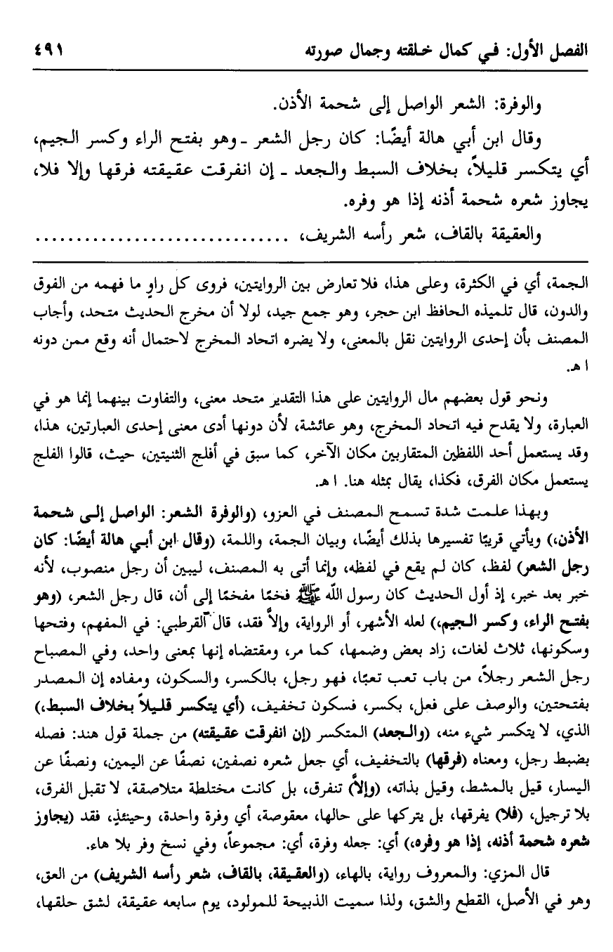 وقال ابن أبي هالة أيضًا: كان رجل الشعر -وهو بفتح الراء وكسر الجيم- أي: يتكسر قليلًا، بخلاف السبط والجعد- إن انفرقت عقيقته فرقها وإلّا فلا، يجاوز شعره شحمة أذنه إذا هو وفره.