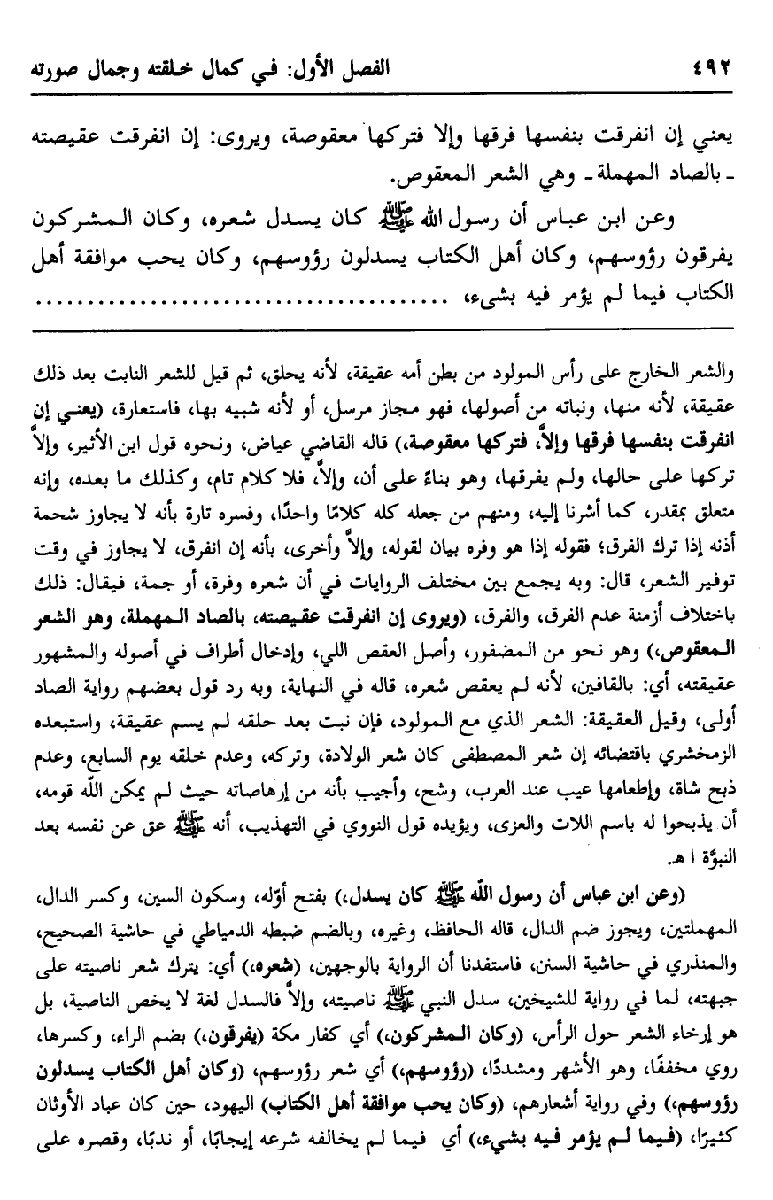 وعن ابن عباس, أن رسول الله -صلى الله عليه وسلم- كان يسدل شعره، وكان المشركون يفرقون رءوسهم، وكان أهل الكتاب يسدلون رءوسهم، وكان يحب موافقة أهل الكتاب فيما لم يؤمر فيه بشيء،