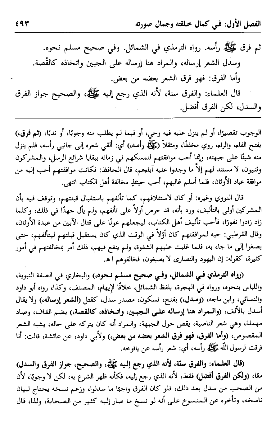 "قال العلماء: والفرق سنة؛ لأنه الذي رجع إليه -صلى الله عليه وسلم، والصحيح جواز الفرق والسدل" معًا، "ولكن الفرق أفضل" فقط؛ لأنه الذي رجع إليه، فكأنه ظهر الشرع به، لكن لا وجوبًا؛ لأن من الصحب من سدل بعد ذلك، فلو كان الفرق واجبًا ما سدلوا، وزَعْم نسخه يحتاج لبيان ناسخه، وتأخّره عن المنسوخ على أنه لو نسخ ما صار إليه كثير من الصحابة، ولذا قال