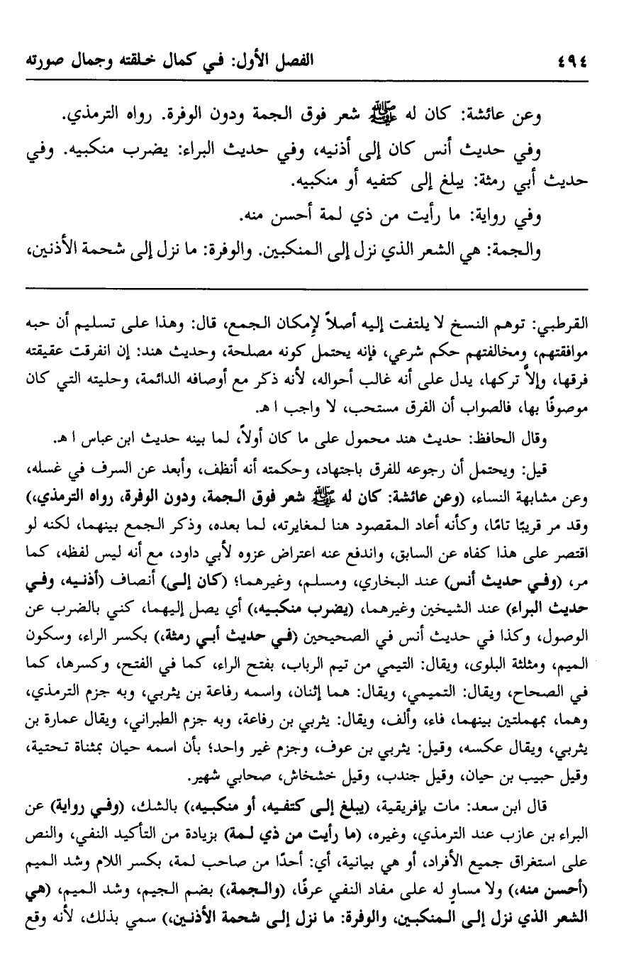 وفي حديث أنس كان إلى أذنيه، وفي حديث البراء: يضرب منكبيه. وفي حديث أبي رمثة: يبلغ إلى كتفيه أو منكبيه.
