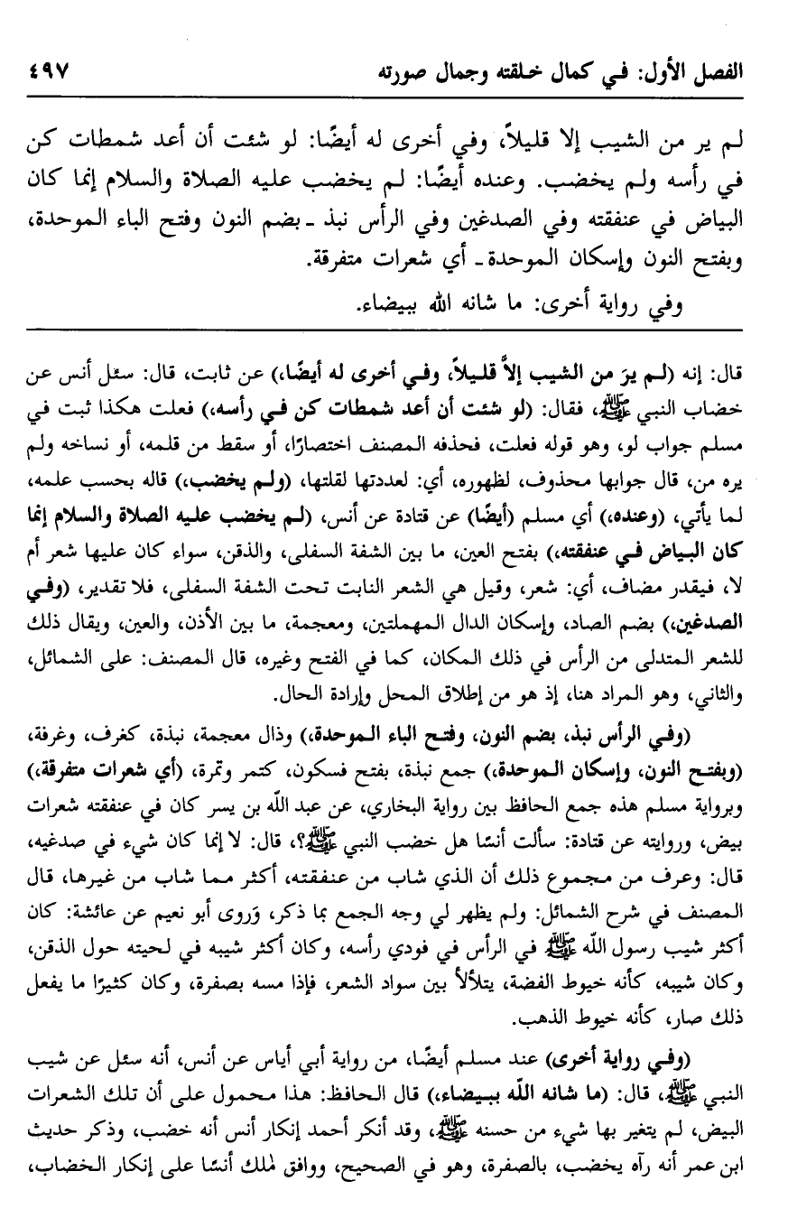 لم ير من الشيب إلّا قليلًا، وفي أخرى له أيضًا: لو شئت أن أعد شمطات كنّ في رأسه ولم يخضب. وعنده أيضًا: لم يخضب -عليه الصلاة والسلام, إنما كان البياض في عنفقته وفي الصدغين وفي الرأس نبذ -بضم النون وفتح الباء الموحدة وبفتح النون وإسكان الموحدة, أي: شعرات متفرقة.