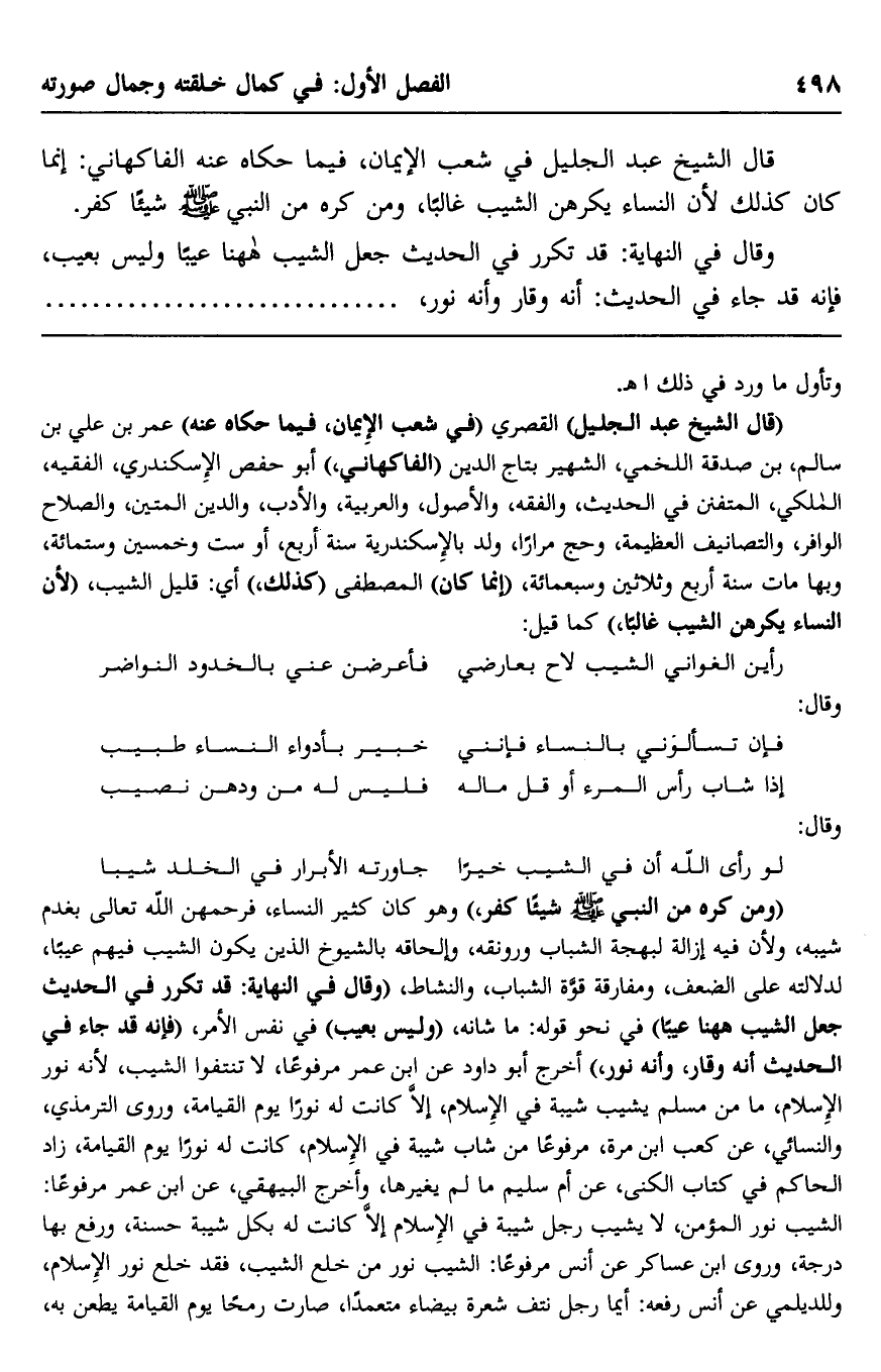 "قال الشيخ عبد الجليل" القصري "في شعب الإيمان، فيما حكاه عنه" عمر بن علي بن سالم، بن صدقة اللخمي، الشهير بتاج الدين "الفاكهاني" أبو حفص الإسكندري، الفقيه المالكي، المتفنّن في الحديث والفقه والأصول والعربية والأدب, والدين المتين, والصلاح الوافر، والتصانيف العظيمة، وحج مرارًا، وُلِدَ بالإسكندرية سنة أربع، أو ست وخمسين وستمائة، وبها مات سنة أربع وثلاثين وسبعمائة، "إنما كان" المصطفى "كذلك"، أي: قليل الشيب؛ "لأن النساء يكرهن الشيب غالبًا"، كما قيل: