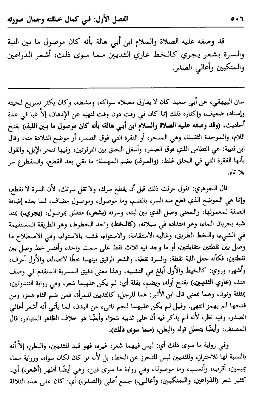 قد وصفه -عليه الصلاة والسلام- ابن أبي هالة بأنَّه كان موصول ما بين اللبة والسرة بشعر يجري كالخط عاري الثديين مما سوى ذلك، أشعر الذراعين والمنكبين وأعالي الصدر.
