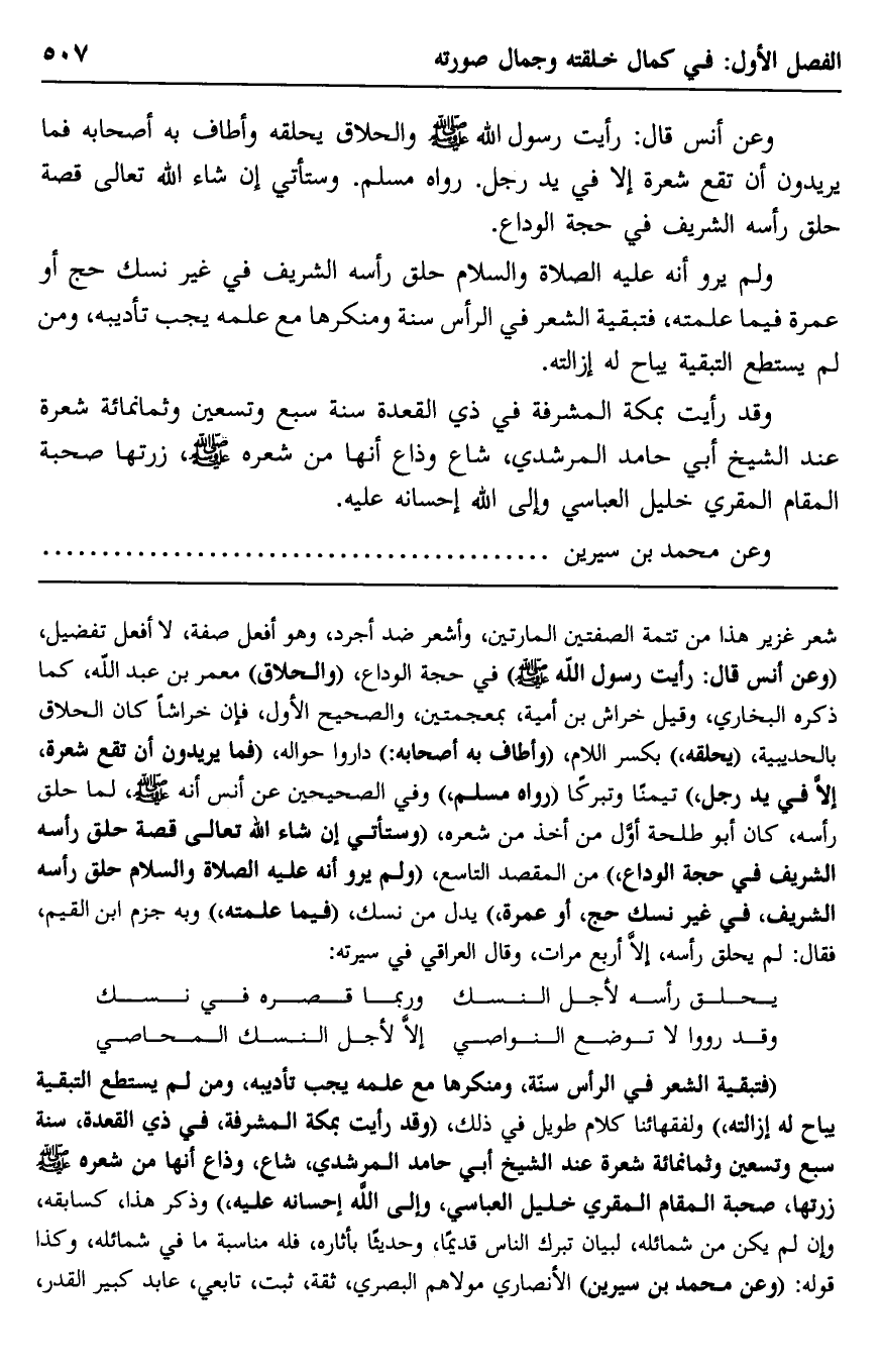 "فتبقية الشعر في الرأس سنَّة، ومنكرها مع علمه يجب تأديبه، ومن لم يستطع التبقية يباح له إزالته"، ولفقهائنا كلام طويل في ذلك، "وقد رأيت مكَّة المشرفة, في ذي القعدة، سنة سبع وتسعين وثمانمائة, شعرة عند الشيخ أبي حامد المرشدي، شاع وذاع أنها من شعره -صلى الله عليه وسلم, زرتها، صحبة المقام المقري خليل العباسي، وإلى الله إحسانه عليه"، وذكر هذا كسابقه، وإن لم يكن من شمائله، لبيان تبرك الناس قديمًا وحديثًا بأثاره، فله مناسبة ما في شمائله، وكذا قوله: "وعن محمد بن سيرين" الأنصاري مولاهم البصري، ثقة ثبت، تابعي عابد, كبير القدر،