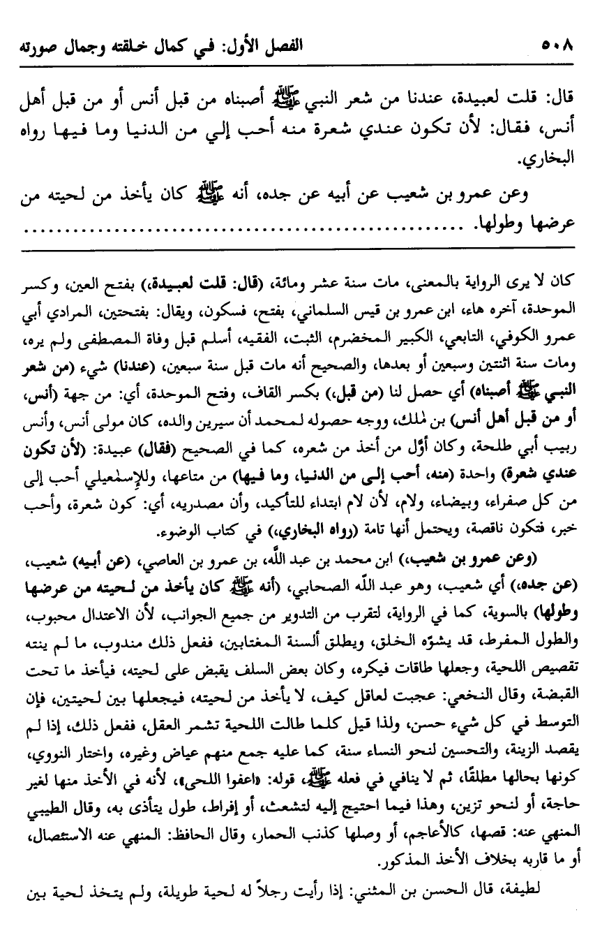 وعن عمرو بن شعيب عن أبيه عن جده، أنه -صلى الله عليه وسلم- كان يأخذ من لحيته من عرضها وطولها