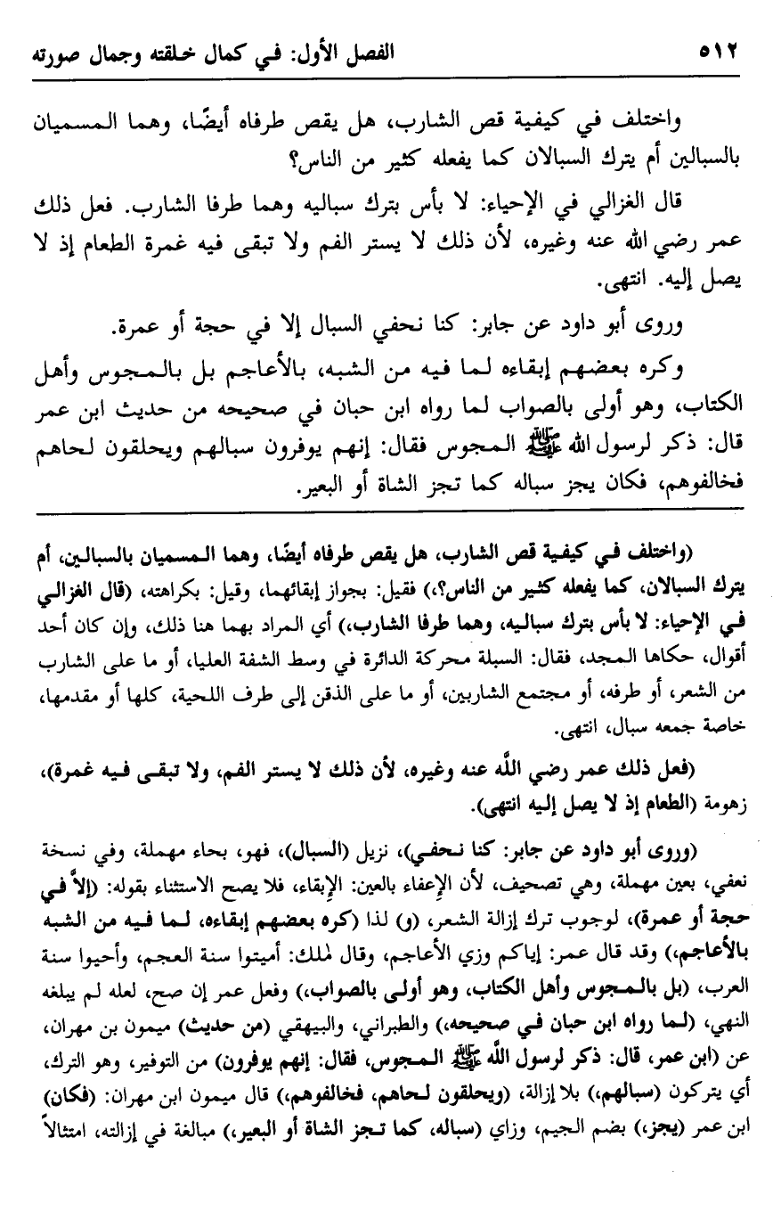 وكره بعضهم إبقاءهه لما فيه من الشبه بالأعاجم بل بالمجوس وأهل الكتاب، وهو أَوْلَى بالصواب لما رواه ابن حبان في صحيحه من حديث ابن عمر قال: ذكر لرسول الله -صلى الله عليه وسلم- المجوس فقال: "إنهم يوفِّرون سبالهم ويحلقون لحاهم فخالفوهم"، فكان يجز سباله كما تجز الشاة أو البعير.