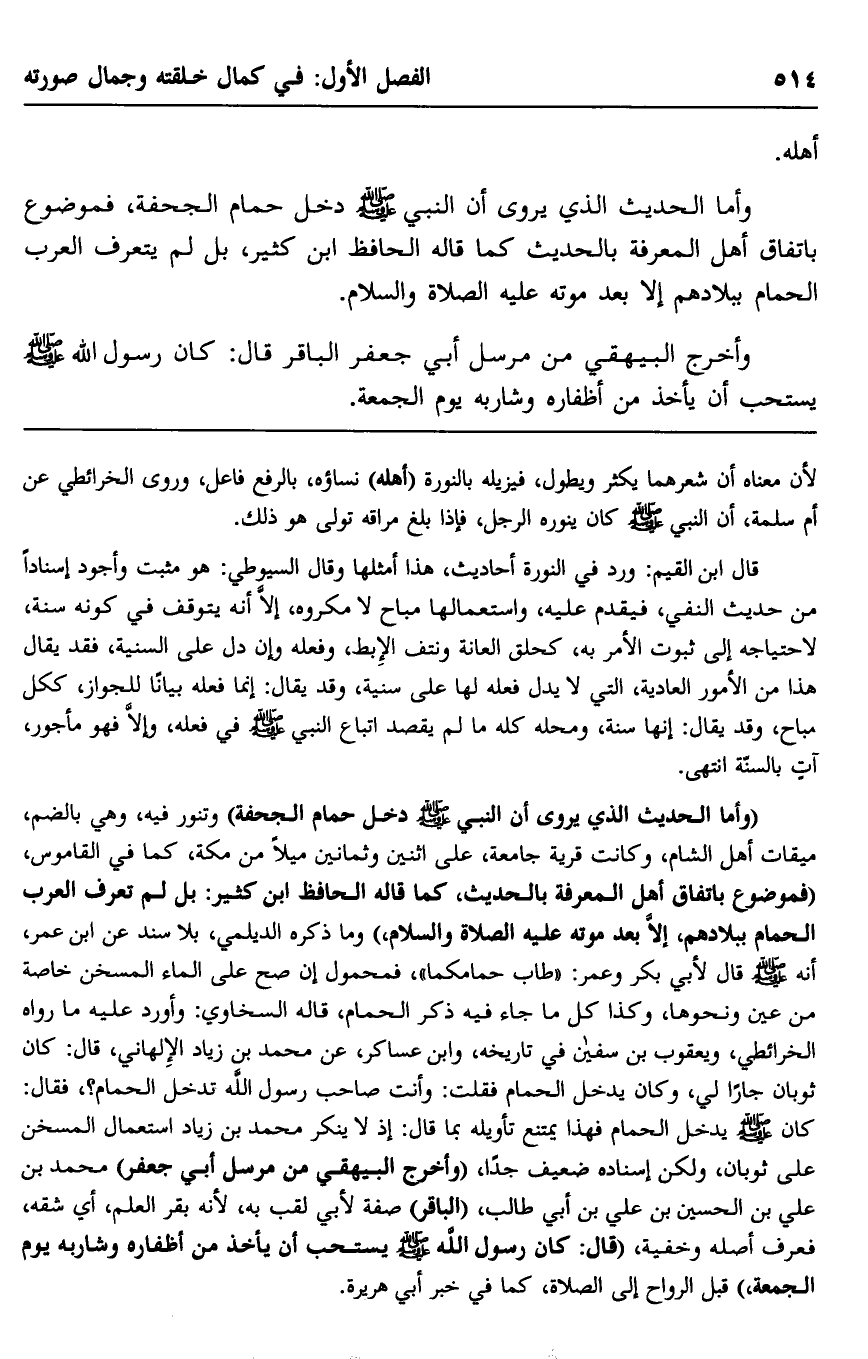وأما الحديث الذي يروى أنَّ النبي -صلى الله عليه وسلم- دخل حمام الجحفة، فموضوع باتفاق أهل المعرفة بالحديث, كما قاله الحافظ ابن كثير، بل لم يتعرّف العرب الحمام ببلادهم إلّا بعد موته -عليه الصلاة والسلام.